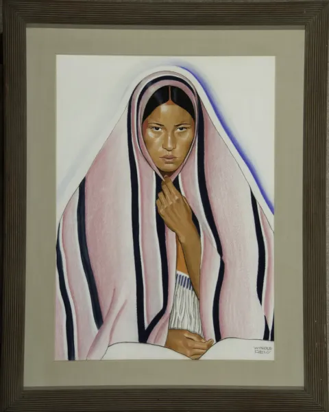 Indian Madonna, which hung in the Longchamps restaurant on Madison Avenue in New York City for 20 years, intersects with this portion of Reiss’ career. The artist had been going to Montana and Alberta, Canada, to paint Native American portraits beginning in 1919. Later, in 1928, he was commissioned to paint similar portraits for the Great Northern Railway. As word got out about these stunning images, Reiss paintings were suddenly in high demand in New York City. Dozens of these Native American portraits ended up in Longchamps, the Art Deco restaurant chain that started in 1919. Peatross and Renate Reiss first pin the Longchamps commissions in 1935, with additional restaurants through the mid-1940s. Longchamps had restaurants all over Manhattan (and in Washington, D.C.), each with its own Reiss theme, including “Louis XIV” and “Swiss and abstract modern.” A Mexican theme decorated the inside of the restaurant at Fifth Avenue and 34th Street, inside the Empire State Building. The Native American-themed restaurant was on Madison Avenue and 59th Street. The chain closed in the 1970s, but Reiss’ designs and architectural additions are still being discovered today.