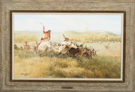 Clymer’s words on the verso read: ”The Beef Issue 1873. Spotted Buffalo. In 1873 when the Red Cloud Indian Agency was moved from the Platte River near Fort Laramie to the White River area some 75 miles north the indian rations were delivered to them there and the beef were issued on the hoof every few days by the cowboys of the beef contractor who had a vast herd on the Platte. The Texas Long Horns of the Beef Issue were very wild, and could run as fast as elk and the Sioux had a glorious hunt riding them down and killing them like they slaughtered the buffalo in pre reservation times. John Clymer.”