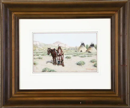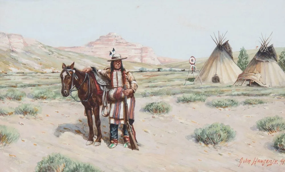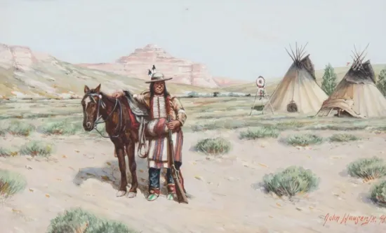 An important Cincinnati artist, friend and contemporary of Henry Farny, John Hauser studied in Munich, Dusseldorf and Paris, developing a realism that combines careful rendering with rich color. In 1901, Hauser’s time among the Sioux earned him adoption into their nation, where he was given the name “Straight White Shield.”