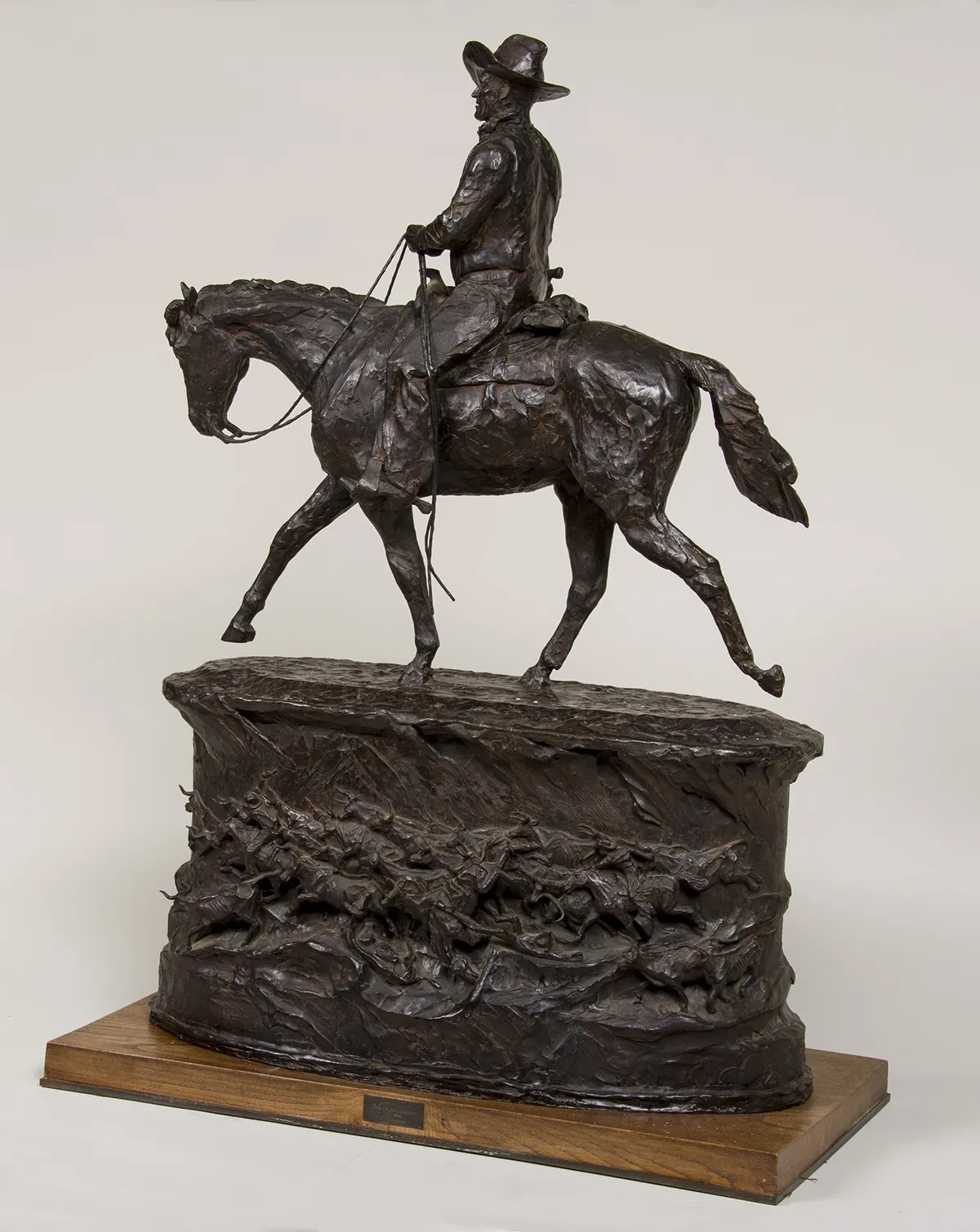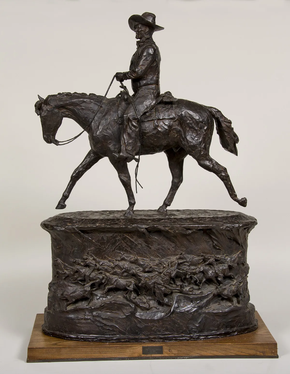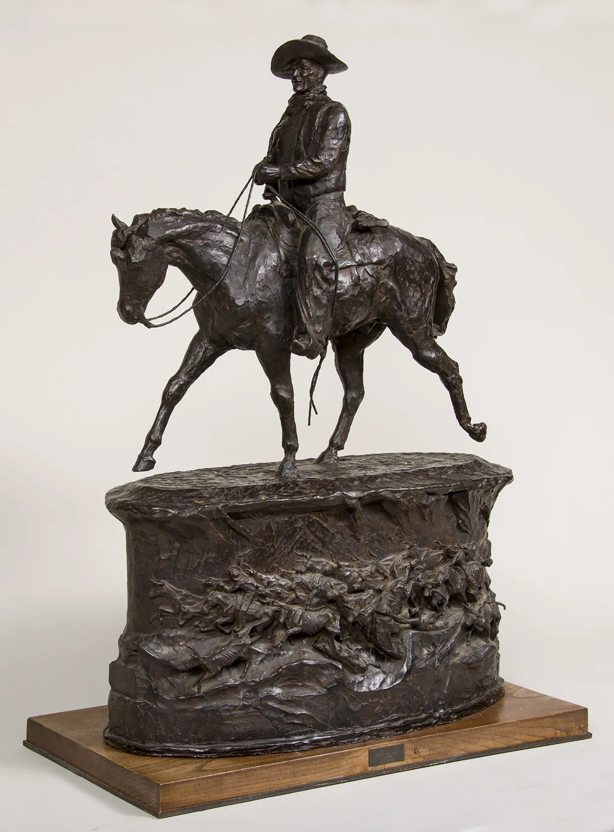 Harry Jackson (American, 1924- 2011). This bronze statue of John Wayne by Harry Jackson was conceived in 1980 as his study for a larger-than-life sculpture of the legendary Western actor on Wilshire Boulevard in Beverly Hills. Jackson’s realistic bronze equestrian sculpture and its impressive bas-relief base featuring scenes of a cattle stampede and a prairie cowboy burial resonates with the tradition of Charles Russell and Frederic Remington. Stunning and in superb condition, a limited-edition bronze by Harry Jackson depicting his friend, the legendary John Wayne.