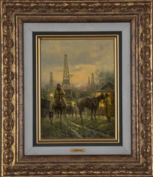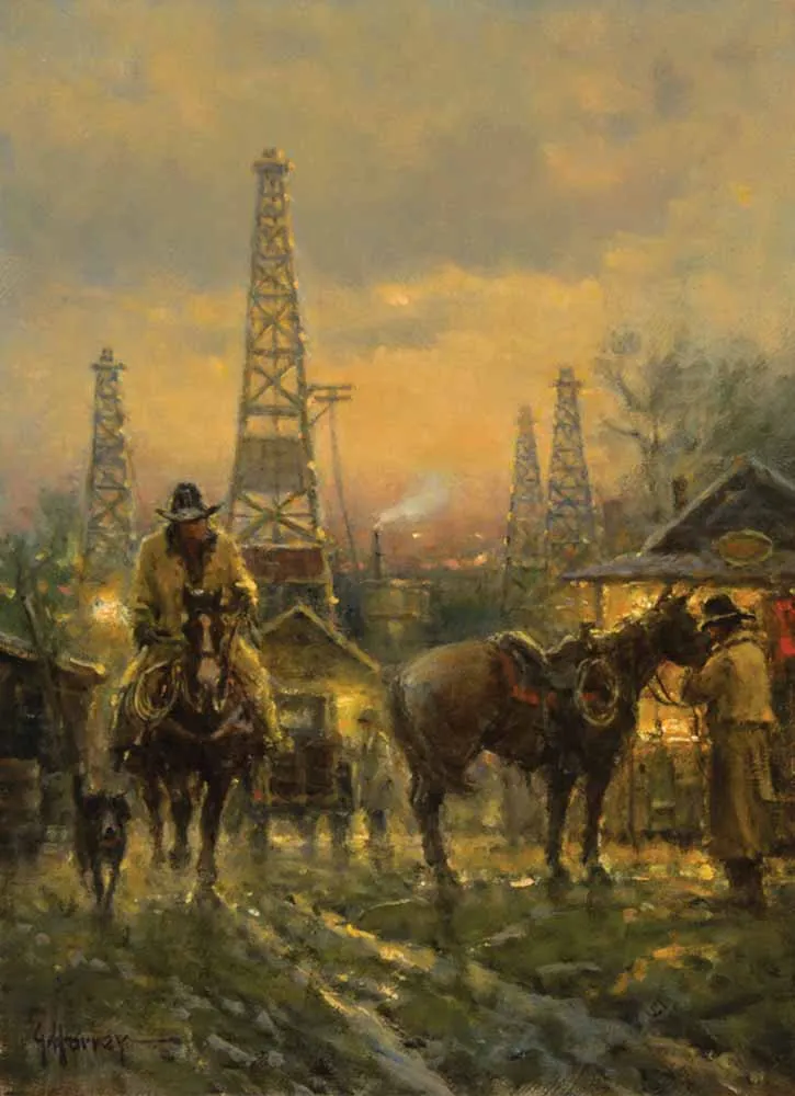 This painting, sometimes shown using the shortened title Black Gold, was part of a long-running series by the artist about the oil fields of Texas and Oklahoma. “Men who gambled their futures on a string of drill pipe in quest of oil wrote one of the most exciting chapters of the Golden Era,” writes Randy Best in G. Harvey: The Golden Era — The American Dream. “They shattered the rural tranquility of sleepy communities across Oklahoma and Texas as boomtowns sprang to life with crowded, muddy streets and blaring saloons. In these early oil men, G. Harvey finds a spirit of adventure, a willingness to take risks, and to confront the odds and challenge fate. He believes these character traits are uniquely American—both the cowboys on horseback and entrepreneurs toiling in the oil field shared this spirit.”