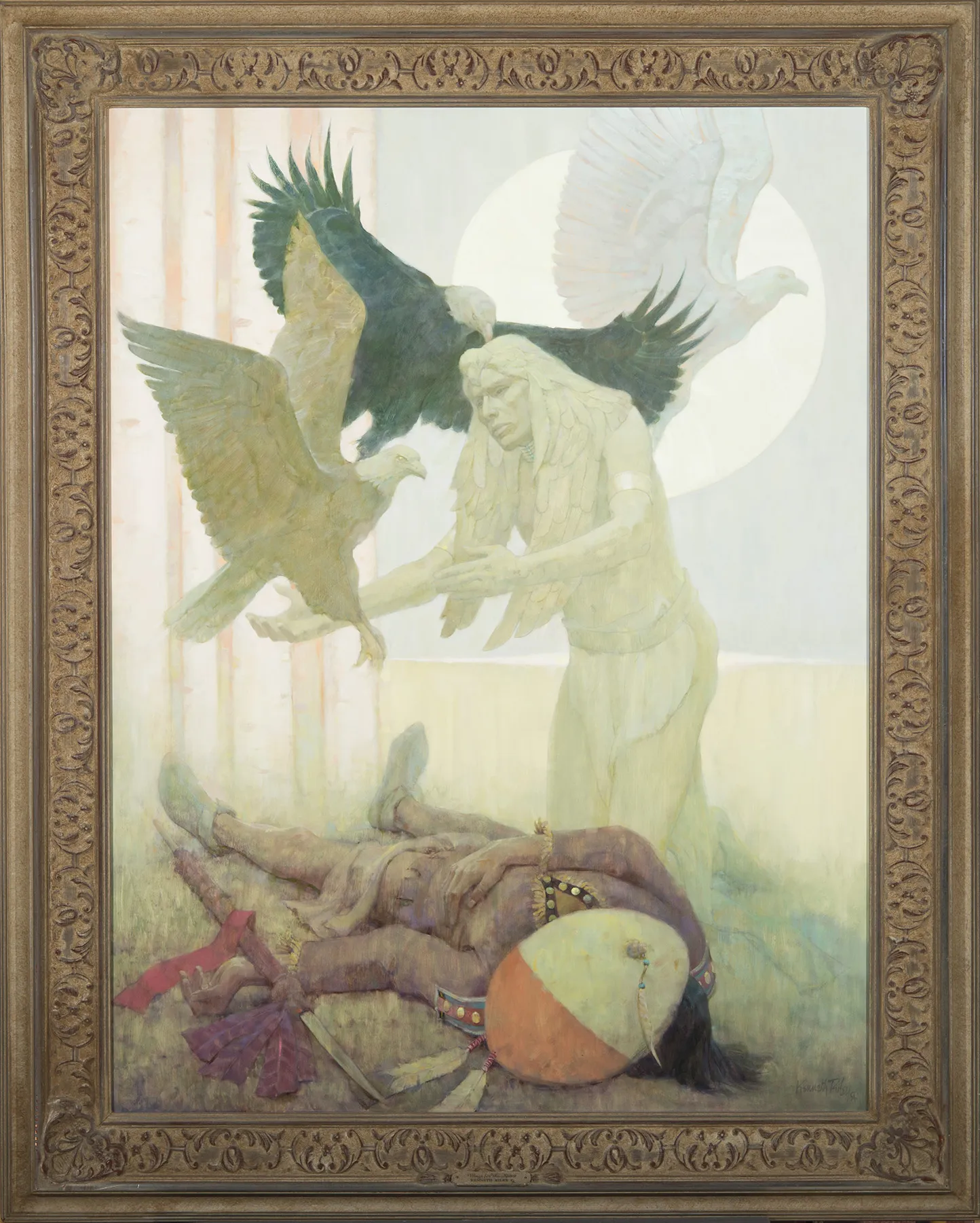 A fallen warrior, spear at his side, shield shielding his face, lies at an acute angle at the bottom of Ken Riley’s Wings for the Spirit. He is the occasion for the painting, but not its subject. Above, an eagle spirit holds his hands out to the warrior’s spirit, spirit meeting spirit, to bear it to the moon (or is it the sun?) where a totemic eagle holds sway. Interestingly, the blue square that dominates the top right of the picture, with the luminous disc and flying eagle, when you see it beside the four birches at left, and the pale pastel orange between them, the whole almost looks like the flag of an Indian nation. The spirit bearer is, of course, a Native American version of the Norse shield maiden, a Valkyrie who takes the warrior’s soul to Valhalla.
