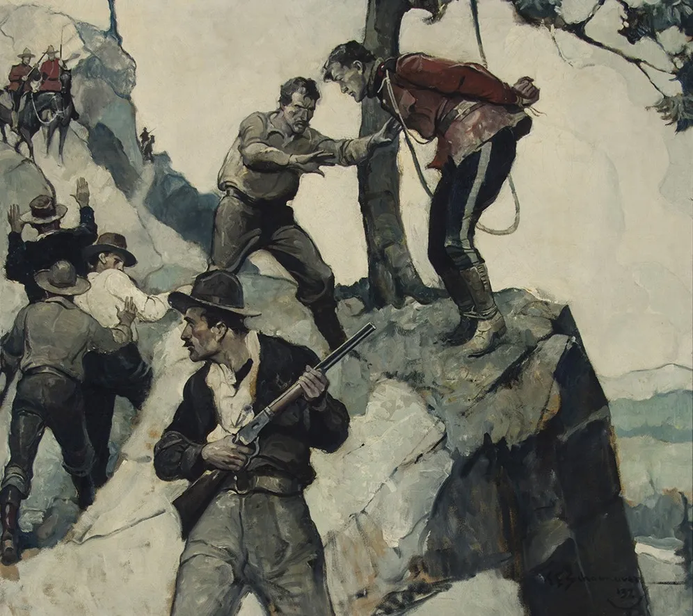 This painting was rescued by the current owners' great-grandfather (Earl E. Styles) when he went to make an appraisal of property at 'The Timbers', a boys camp located on Mullet Lake near Topinabee, Michigan. The camp was scheduled for demolition. This painting and two others by Schoonover (as well as seven other original illustrations by Stockton Mulford) were being used as window coverings. The appraiser, Earl E. Styles,made an offer of $5 each for each of the ten, and the offer was accepted. They have since hung in the offices or homes of descended family.