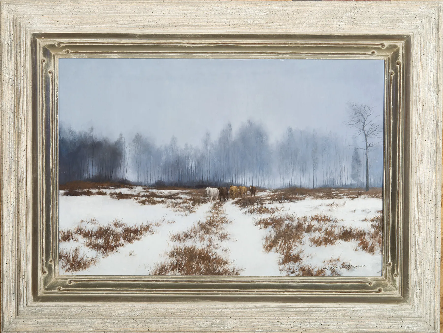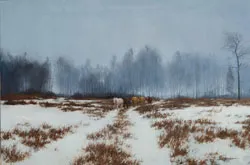 Lanford Monroe delved deeply into the soul of American realism. Influenced by her father and mother, artists C. E. and Betty Monroe as well as her parents’ neighbors–none other than John Clymer and Bob Kuhn–Monroe sought a romantic balance between the seen, unseen and half-seen, transforming and transcending her instructors’ lessons. In Soup’s On, Monroe tempers the urgency of a line of ponies whose internal clocks have just sounded the feedbag alarm with a quiet winterscape of soft, leafless trees and a slate gray sky.