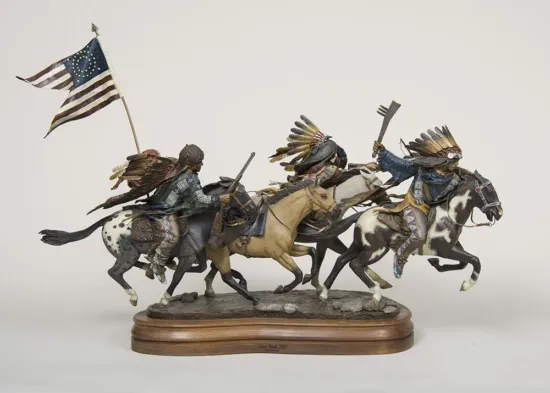 This piece commemorates the Battle of Last Stand Hill, which took place on the banks of the Little Big Horn River in Southern Montana territory on June 25, 1876, about fifteen thousand Native people were in the area, the largest concentration that history has ever recorded. This was the biggest defeat of the U.S. Army by the Plains Indians. This sculpture consists of four horses and three riders carrying guns and an American flag.