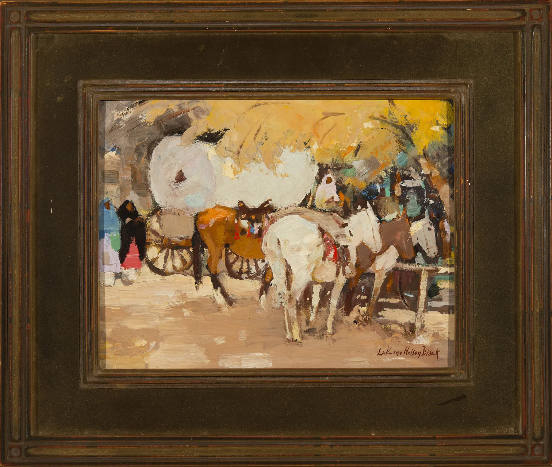 With effortless thick strokes of color, Laverne Nelson Black constructs a benevolent fall moment in Taos. The white of the canvas covering the wagon mirrors the white of the horses and the white of the cloak on the rider at right. Black works the other colors–the browns and tans and blues in a similar fashion, moving them through the picture. Splashes of red create interest and the yellow aspens nod over the scene.