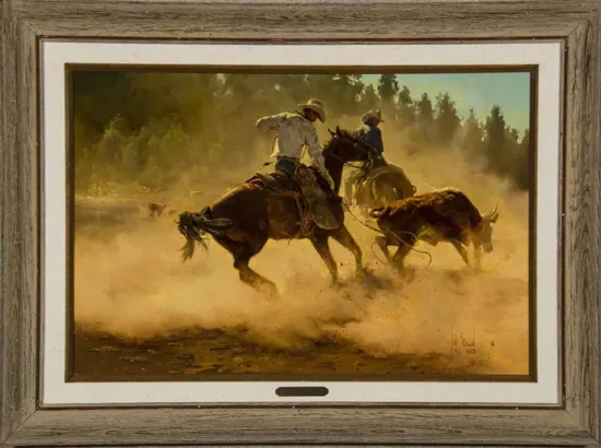 Laying a Heel Trap was created in 1973, the year Bill Owen was voted into the Cowboy Artists of America, a group he would serve in and lead for four decades. The Arizona-based artist was celebrated not only for his paintings but also his sculpture work—founders Joe Beeler, George Phippen and Johnny Hampton were also artists who worked in paint and clay. Owen’s sculpture career would end in 1989 after a rodeo accident made him blind in one eye. Donning an eyepatch after his accident, Owen didn’t miss a beat and continued painting to great acclaim. The title of the painting refers to a type of throw used in roping cattle—many riders use a heel trap, or a sweeping scoop maneuver to rope the rear legs of a cow.