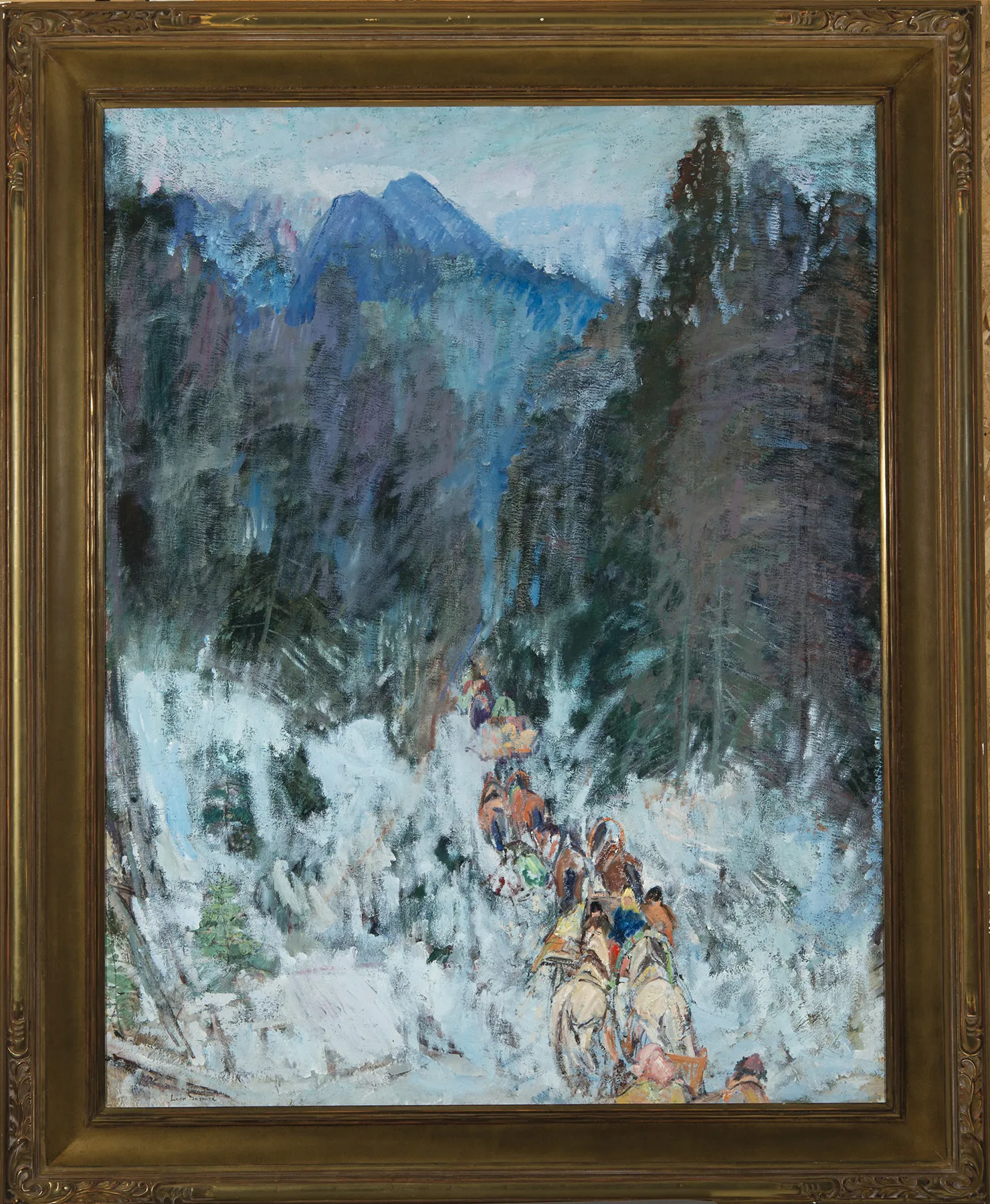 Born near Moscow, Leon Gaspard studied at the art school in Vitebsk–alongside Marc Chagall–and went on to train in Paris, where he met and married an American woman, Evelyn Adell. During World War I, Gaspard joined the French Air Corps. As a result of the serious injuries he sustained when his plane was shot down, Gaspard’s wife urged him to seek treatment in America. By 1916, Gaspard was in New York, recuperating and making a name in the rough-and-tumble of the city’s art scene. He exhibited scenes from the war in France and Russia at Reinhardt’s, one of the most important galleries of the era. The New York Times called these works, “fresh and brilliant and infinitely the better for complete lack of sentimentality.” Gaspard’s new artist friends described the healthful climate in Taos, and in 1919 he moved there. To him, the people and landscape of Taos echoed the Tartar countryside in the Russia of his boyhood. Like his classmate Chagall, Gaspard builds layers of broad strokes, creating vivid dreams on canvas. Other similarities between the two crop up in their swirling and spiky impastos, daring colors, and an approach to composition, apparent in problems of perspective, that deliberately integrates a folk art naiveté.