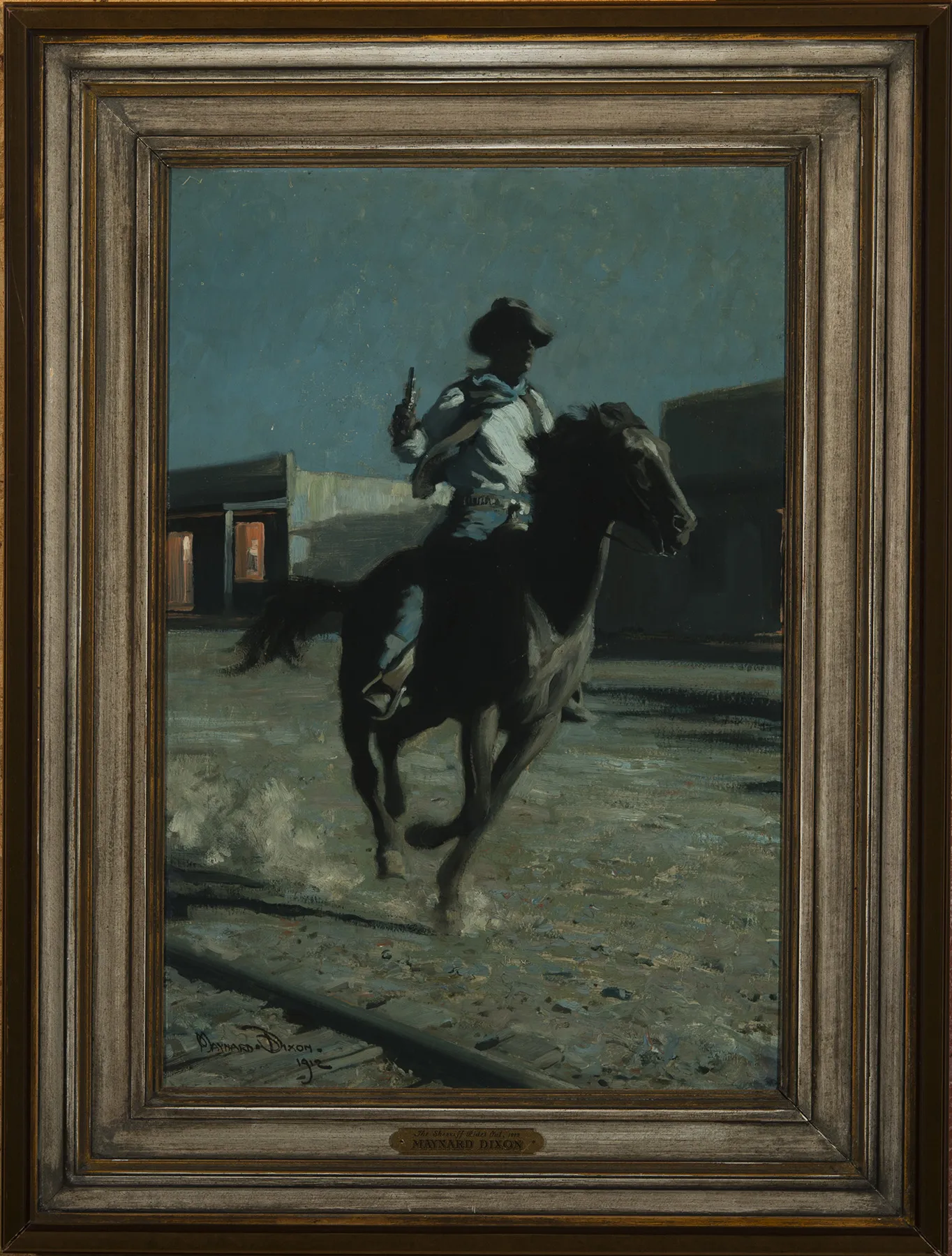 Bob McGraw, the “Leading Man” in author Peter Kyne’s “The Long Chance,” a Western novel serialized in Sunset Magazine, is the subject of Maynard Dixon’s brawny and moody action painting. Here’s how Kyne describes him: “He was tall enough but his hair was not crisp and curly and golden. Most people would have called it red. Not, praise be, a carroty red, a dull negative, scrubby red, but a nicer red than that–dark auburn, in fact… In but one particular did he resemble the dream man. He did have a cleft in his chin… The only thing romantic and–er–literary about Bob McGraw was his Roman-nosed mustang, Friar Tuck–so called because he had been foaled and raised on a wooded range near Sherwood in Mendocino County.” Bob McGraw’s lady love is Donna Corblay. His rival for her affections is the wealthy Gerald Van Alstyne. At the moment of the painting, McGraw has spotted Donna riding her velocipede (that’s bicycle to you) out of town. And, of course, she has just been accosted by three men. And, of course, Bob, true natural knight of the range that he is, rides to her rescue. Dixon wisely sculpts the hero and his steed out of flowing mooncast shadows, thereby allowing the viewer to create and project a persona onto Kyne’s classic protagonist.