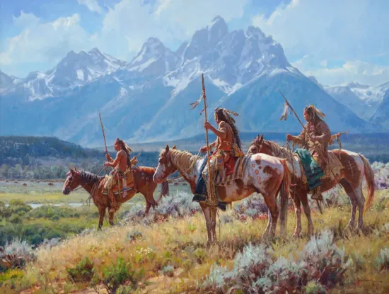 One of my favorite places in the American west is the area near the incredible mountains of the Teton range, which were called the Teewinot by the Shoshone people who inhabited the area for centuries. The name means “many pinnacles”. Many Native American peoples would come to this bountiful valley during the summer months to hunt buffalo and other game, including the Shoshone, Blackfeet, Gros Ventre, and Apsaalooke (Crow). I have chosen to depict Apsaalooke warriors for the painting, as they come into a low-lying area with a group of buffalo moving and grazing in the distance. It would have been an incredible scene to see at that moment in time, as it still is today, where the buffalo still roam through this beautiful valley. - Martin Grelle