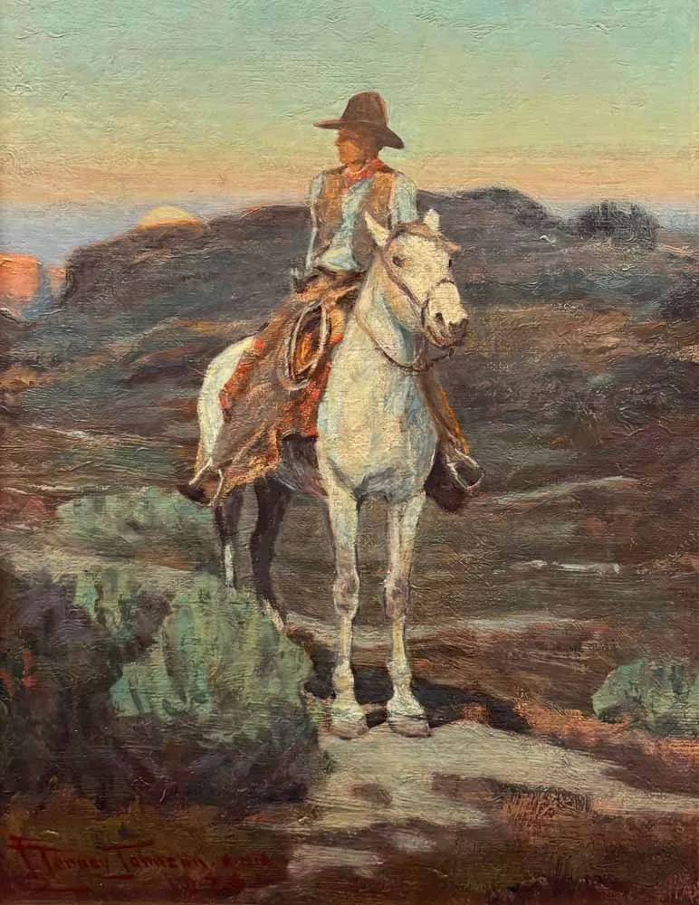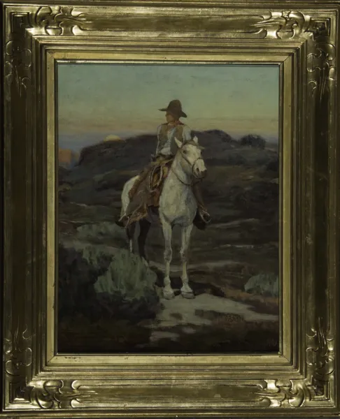 Master of the Western nocturne, Frank Tenney Johnson was also fond of the sub-category of moonrises, a subject that he sporadically painted dozens of times across his distinguished career. With works such as Moonrise Over the Mesa, Apaches at Moonrise, Coyote Moonrise and here in Moonrise Over the Trail, Johnson paints the arrival of the moon against the horizon as a spiritual moment for both man and beast. This tracks with his own history among Native American people, who almost universally view the moon as a sacred symbol in the sky. During a radio broadcast in 1925 at the Buffalo Bill Historical Center, a fan of his work told him, “[Y]our moonlights seem to me to possess the impalpable elusive mystery that moonlight has.” Years later, Johnson partially explained his fascination: “I like to think of moonlight as nature’s indirect lighting,” he told the Christian Science Monitor in 1931. “In the far West, where the air is clear, you can see all the essential structure of the rocks by moonlight, and a good deal of color detail in the foreground.”