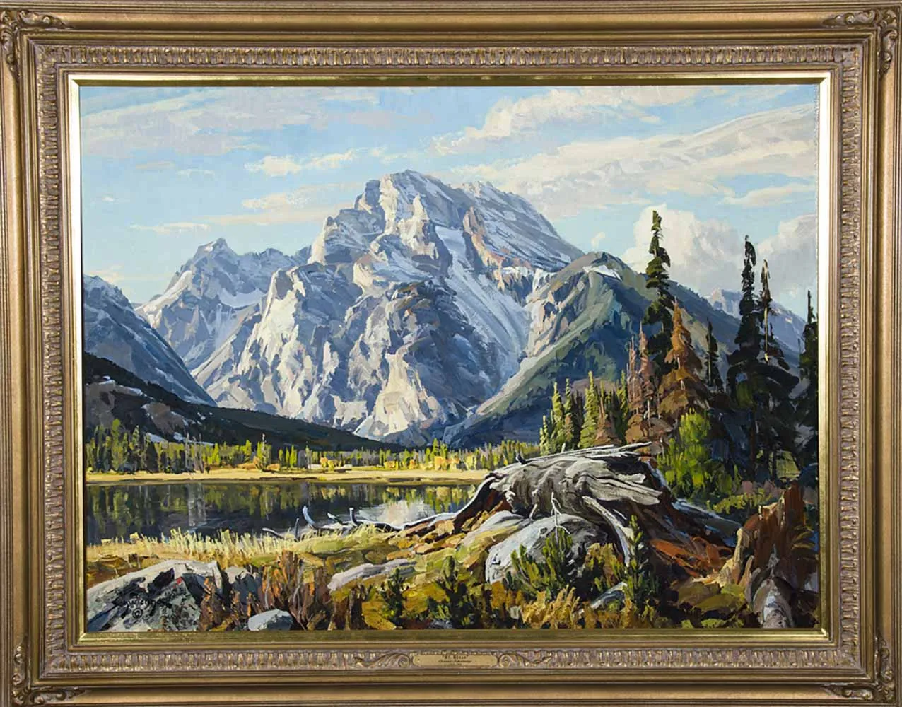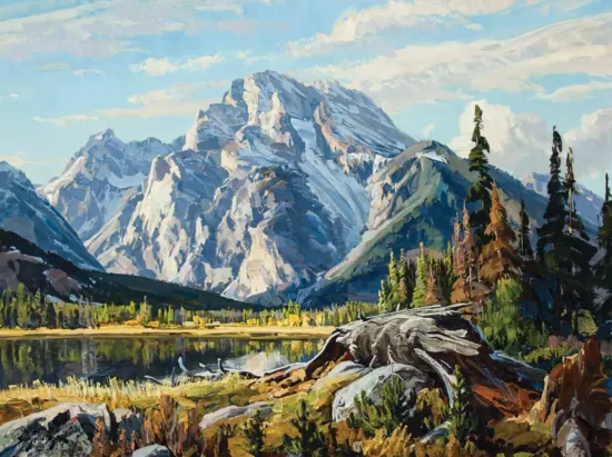 There are 56 named peaks in Grand Teton National Park and Mount Moran is the fifth highest, rising 12,605 feet amid a gallery of snow-capped peaks in western Wyoming. The park was named after painter Thomas Moran, who was a member of the 1871 Hayden Geological Survey that explored northwest Wyoming and eventually led to the formation of the National Park System. Conrad Schwiering created this image of the famous peak in 1974, 102 years after it was named. The artist, born at the foot of the Rocky Mountains in Colorado, later settled in Wyoming, where he would paint many of the peaks, especially Mount Moran, which he could see from his studio window. The artist famously tried to paint outdoors daily, regardless of weather or condition, a practice he said helped hone his understanding of light, composition and subject. During his career, he was honored with many one-man shows, including an important exhibition at the Gilcrease Museum in 1985. The following year, the artist passed away doing what he loved, planning a painting on the beach at Point Lobos State Park in California. After his death, the bulk of his archives and studio were donated to the Nicolaysen Art Museum in Casper, Wyoming.