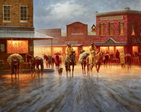 While visiting small towns throughout the Northwest I have always appreciated the warmth and comfort they bring. Things like a hearty meal at the local cafe just off Main street and the friendly hospitality of the people. The historic architecture of these places has always intrigued me and has inspired me for several years to portray them on canvas through the eyes of the rustic cowboy. -Gary Lynn Roberts