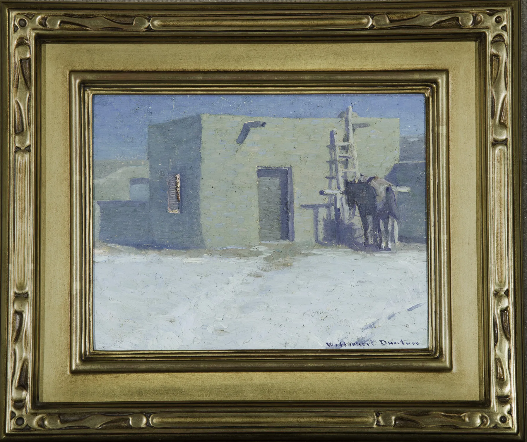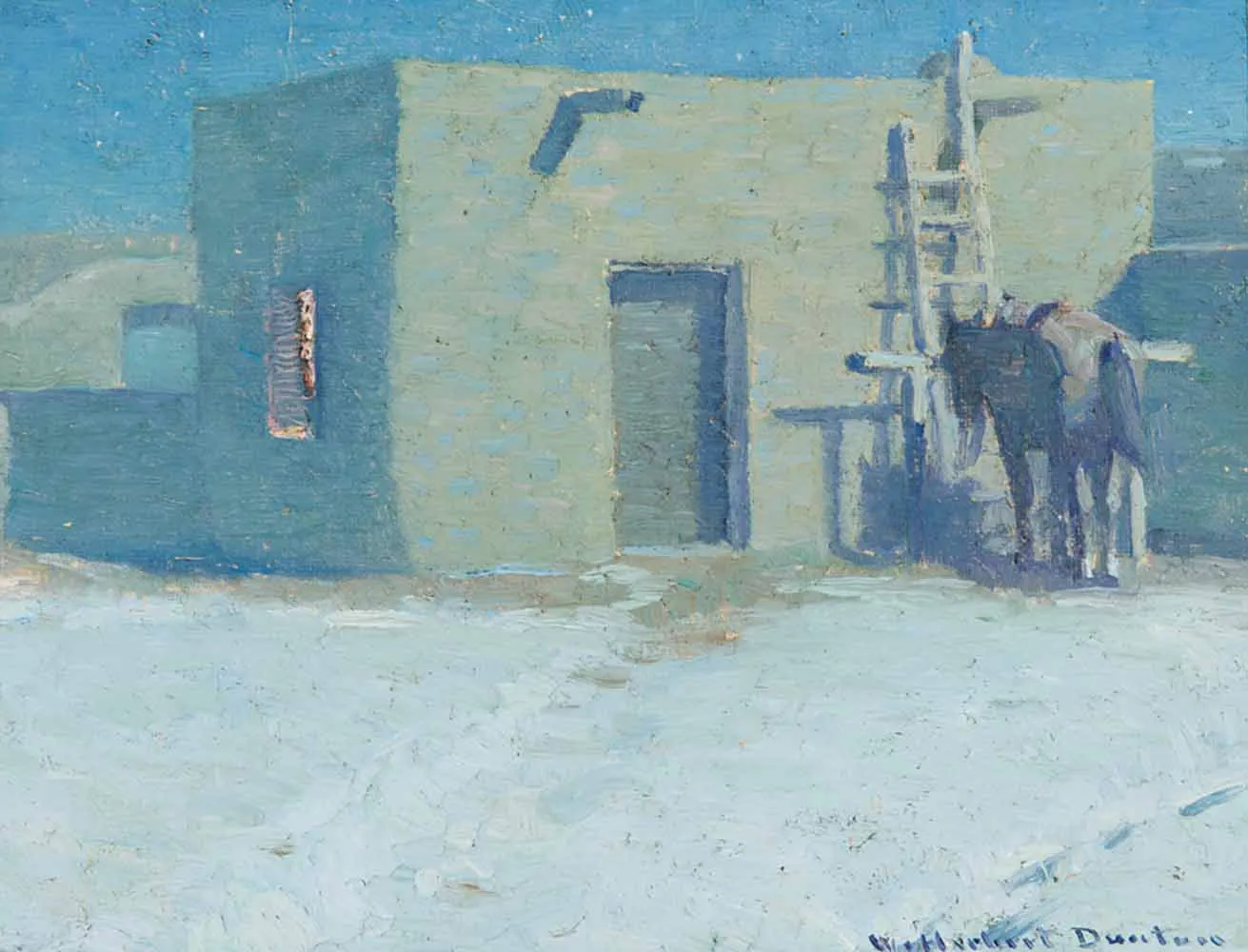 Of the six founders of the Taos Society of Artists, William Herbert “Buck” Dunton was the last to arrive in Taos, New Mexico. He would also be the first to die, and he was also the youngest at the time of his death at just 57 years old. And yet, in a shorter period of time, Dunton put his stamp on the West through his remarkable work. He also dearly loved Taos. In 1922, he wrote: “And when we speak of Taos it is not alone the cluster of grey, adobe buildings that crest the hill and constitute the town, but of the undulating swells of the sagebrush valley as well; the tiny Mexican settlements that dot the cottonwood fringed rivers; the skies of marvelous blue through which pass, in summer, regiments of stately clouds; the majesty of the mountains—those serrated, rugged peaks to the east and north and the gentler tone of the remoter ranges low lying in the west.”
