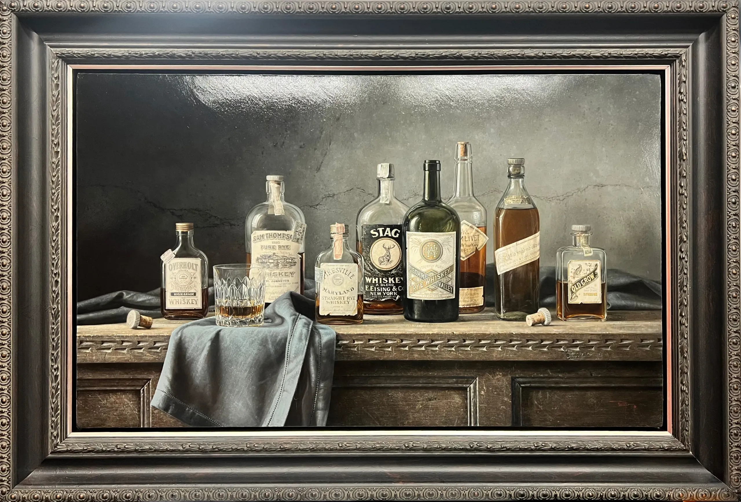The warm glow of aged whiskey radiates from a collection of half-empty bottles. The play of light and shadow accents the intricate details of each label, weathered by the years. The composition captures a sense of quiet contemplation, inviting viewers to remember bygone moments and the allure of well-aged spirits.-Kyle Polzin