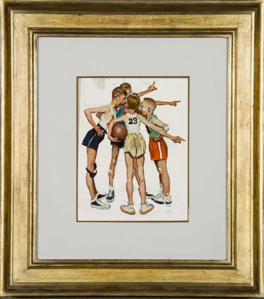 Beginning in 1947, Norman Rockwell illustrated annual editions of Four Seasons, a popular series of calendars for the Brown & Bigelow company. The calendars featured four images, with three months of the year below each of the pictures. Rockwell had been creating artwork for an annual Boy Scouts of America calendar since 1925, so the calendar concept was not a stretch for the artist. After its introduction, the Four Seasons series was a huge hit and it continued for 17 years. For the 1951 calendar, Rockwell discovered his subjects during a chance trip two years earlier. “In the winter of 1949, Norman Rockwell and his family temporarily resided in Southern California, where he taught courses at the Los Angeles County Art Institute,” writes Stephanie Plunkett, deputy director and chief curator at the Norman Rockwell Museum. “He discovered the models for this series nearby, roughhousing in a schoolyard football game. For a modest sum, the boys consented to bring their basketball, baseball, golf, and football equipment over to the Institute, where they enthusiastically posed for Rockwell and his photographer.”