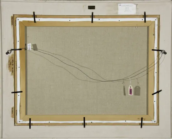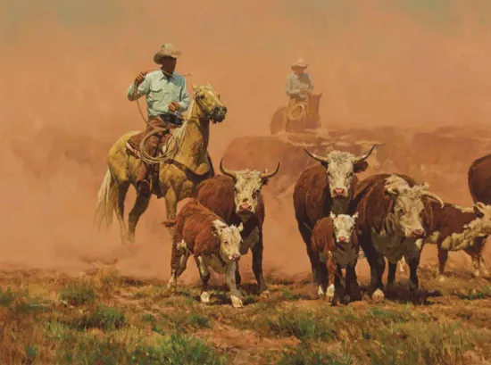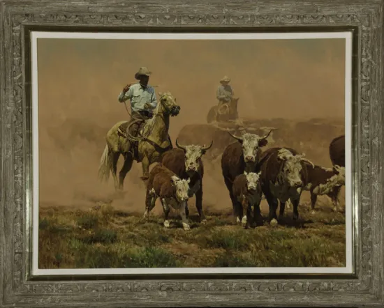 Authenticity was key for Bill Owen, the large and commanding figure who painted working cowboys throughout his career in the West. Born to a cowboy father and an artist mother, Owen was a merging of his parents’ interests. He lived all around Arizona, particularly in areas with rough country that would serve as inspiration for his cowboy paintings. He joined the Cowboy Artists of America in 1973 and helped stabilize the group in the 1970s and 1980s, and again after the passing of Joe Beeler in 2006. For this work, “on the drag” refers to the cowboys that ride behind the herd to keep it moving, including the slower cows with their calves. These rear positions can be exhausting and dusty, and are sometimes reserved for greener cowboys.