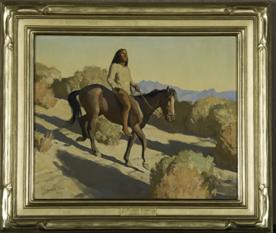 After Maynard Dixon moved to Tucson, Arizona, he made a series of visits to surrounding Native American communities in the winter of 1939-40. The trip put him in contact with Pima and Papago Indians. Dixon and his wife, painter Edith Hamlin, attended ceremonies and rodeos, and they painted and made sketches of much of what they witnessed. Descendants of the Hohokam, the Pima people, also known as Akimel O’odham, have lived in central Arizona for centuries. Pima Indian, from 1940, was directly inspired by those winter trips.