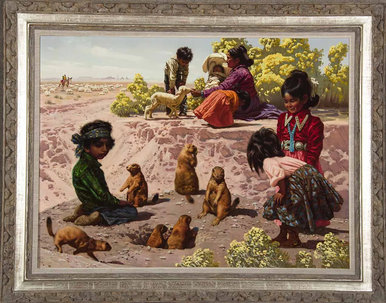 Although his portraits of Native Americans—young faces with flawless skin, and old faces with deep canyons of wrinkles—are quite popular among collectors, R. Brownell McGrew’s elaborately composed group scenes are equally impressive, and also quite rare. He staged his subjects, often Navajo figures, with intricate placement, almost like human still life, tableaus of the desert’s first and final inhabitants. One must leave Western art entirely to find an artist who made comparable work: French painter Georges Seurat, whose iconic A Sunday Afternoon on the Island of La Grande Jatte fills the scene with carefully arranged figures in an outdoor setting. Seurat was famously working in pointillism and impressionism, and McGrew worked in a stylized Western realism with hints of impressionism, but the compositional intricacy among many figures can be seen in both artists’ works. This painting, which has had only one owner, also adds another prominent feature in McGrew’s work—children, which the artist painted in hundreds of images. A former illustrator who worked in Hollywood for a brief period, McGrew wanted his work to have a wet look, which he achieved by mixing oil paint with linseed oil and turpentine.