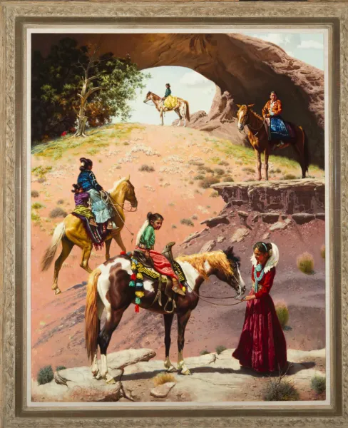 R. Brownell McGrew worked in the film industry before becoming a full time painter specializing in Hopi and Navajo subjects. McGrew referred to himself as “an Impressionist in the classical sense,” though he paints to a much finer level of detail, as opposed to the Impressionists, and his paintings often have a “wet look” because he mixed his colors with linseed oil to achieve levels of luminosity that he felt suited the landscape and peoples of the desert. In Under the Arch and in Hidden Valley, you see the generational aspect in McGrew’s work, especially when the subjects are women. Mothers watch over, lead, and teach daughters, grandmothers teach granddaughters. A sense of dream pervades each work–as, indeed, the little girl in Hidden Valley dreams away the heat of afternoon in the shade of a tree.
