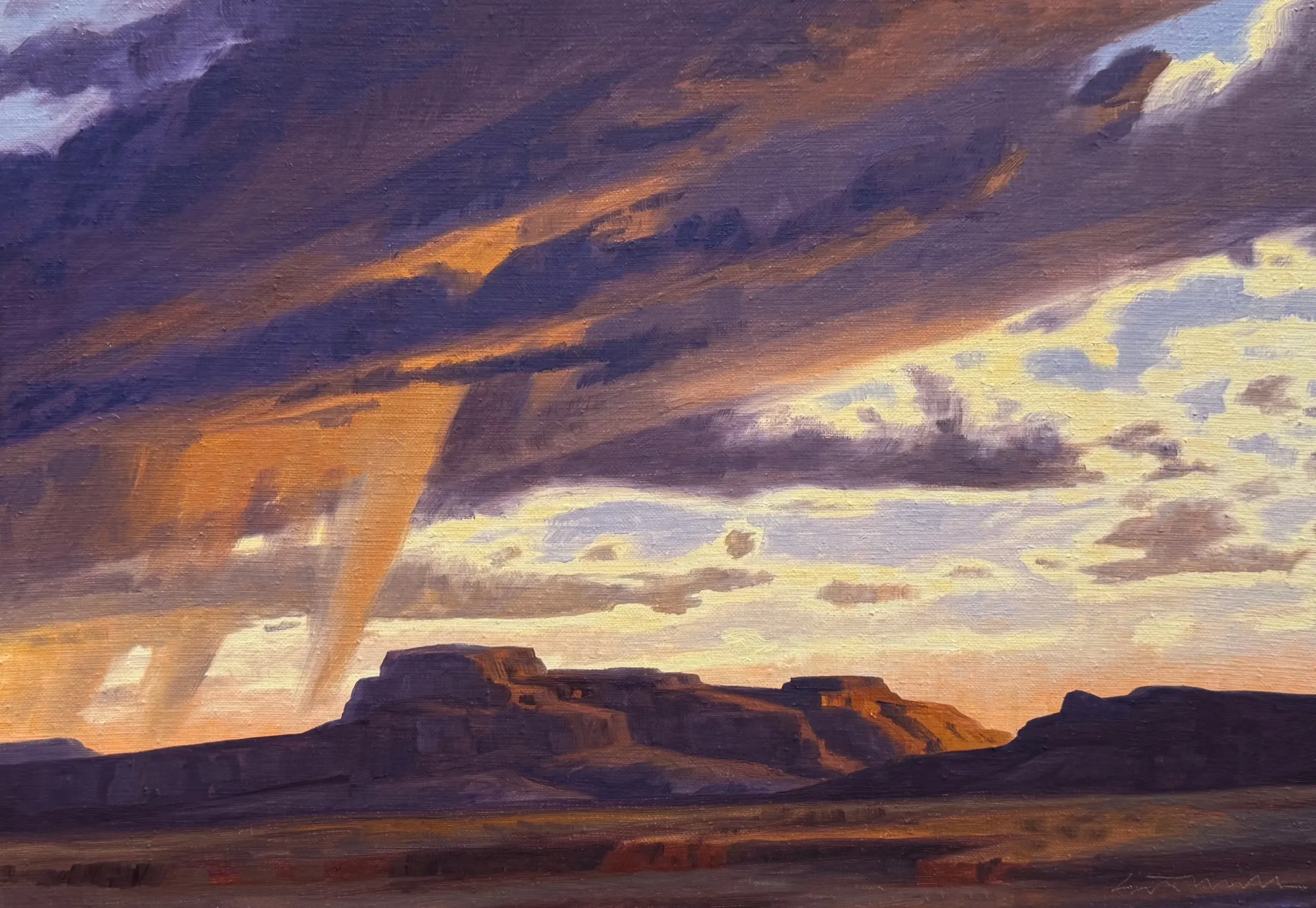Mell is known today for his abstracted landscapes of the Southwest, but his work was more representational when he started his career in the 1970s. As Ed traveled Arizona, sometimes by helicopter with legendary newscaster Jerry Foster, he began to gravitate toward the unique light and forms that the desert offered. Mell was a true artist who loved nothing more than to be in his studio in front of his easel creating art. Later in his career, he loved to make up his compositions completely from his own imagination and let his true artistry take over. In these works, Mell interpreted desert thunderstorms, dry river valleys, monolithic rock formations and of course cloud-filled skies through his geometrical and abstract approach of viewing nature.
