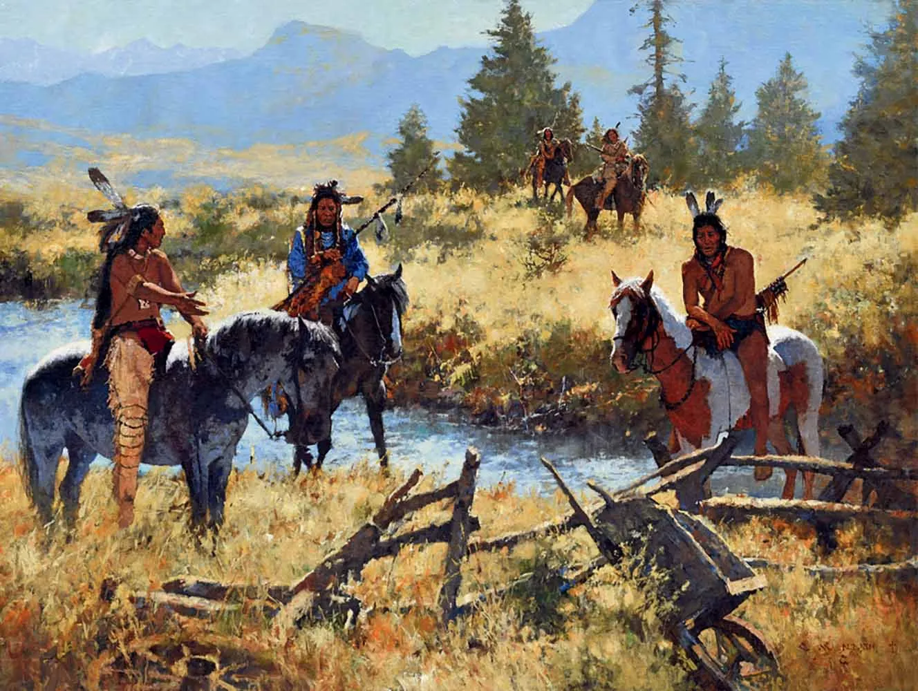 A group of Crow warriors come upon the ?remnants? of a failed homestead in the shadow of the Bighorn Mountains. The beauty of this backlit scene can?t hide the fact that trying to surviving in the wilderness of the American frontier was often a losing proposition. - C. Michael Dudash
