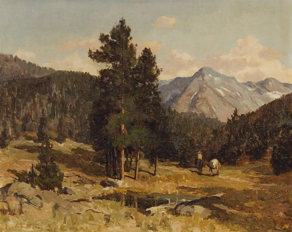 Fremont Ellis was an American painter (1897-1985) primarily known for his landscapes, especially those depicting the Southwestern United States. His art is characterized by an impressionistic style, capturing the beauty and light of the New Mexico landscape. Ellis developed a strong connection to New Mexico, where he lived and worked for much of his life. He was one of the founding members of Los Cinco Pintores (The Five Painters), a modernist art society in Santa Fe that played a crucial role in establishing the city as a center for avant-garde art in the early 20th century, though Ellis's style leaned more towards realism than the group's declared modernist orientation Ellis's painting "Repose" is one of his many landscape paintings of his beloved New Mexico.