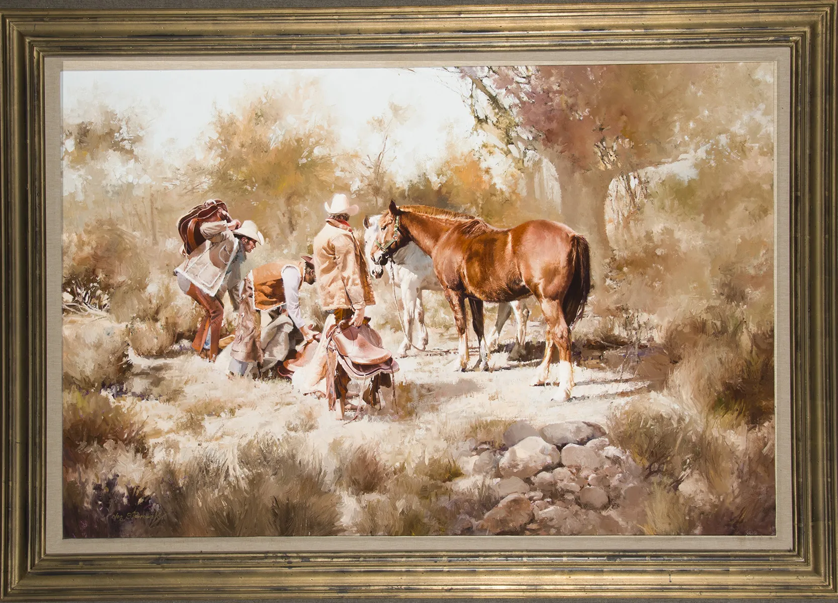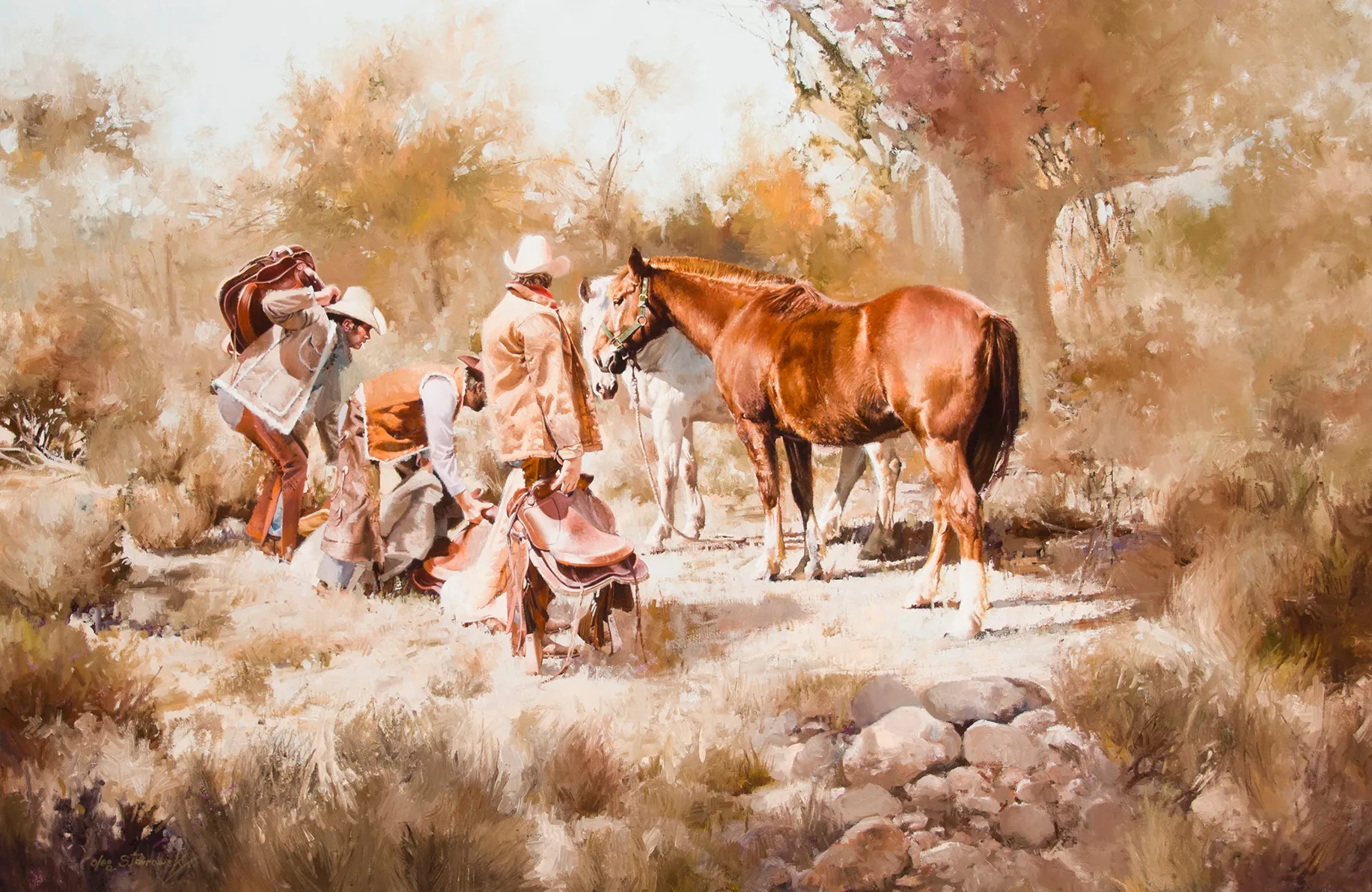 Oleg Stavrowsky was born in New York City and was drafted into the Army during World War II, He served in Europe and was honorably discharged as a staff sergeant in 1949. He worked as an illustrator especially in the aircraft and fashion industries. In the late 1960s, Stavrowsky visited Oklahoma City and found his way to the Cowboy Hall of Fame, now called the National Cowboy and Western Heritage Museum and later wrote,” I liked what I saw and made up my mind that I’d like to give that a try. I guess we all like Cowboys and Indians.” Stavrowsky’s subjects range from Western art to Native Americans, jazz musicians, automobiles, oil-drill paintings and even abstracts. He passed away at home in Cedar Park, Texas in May of 2020.