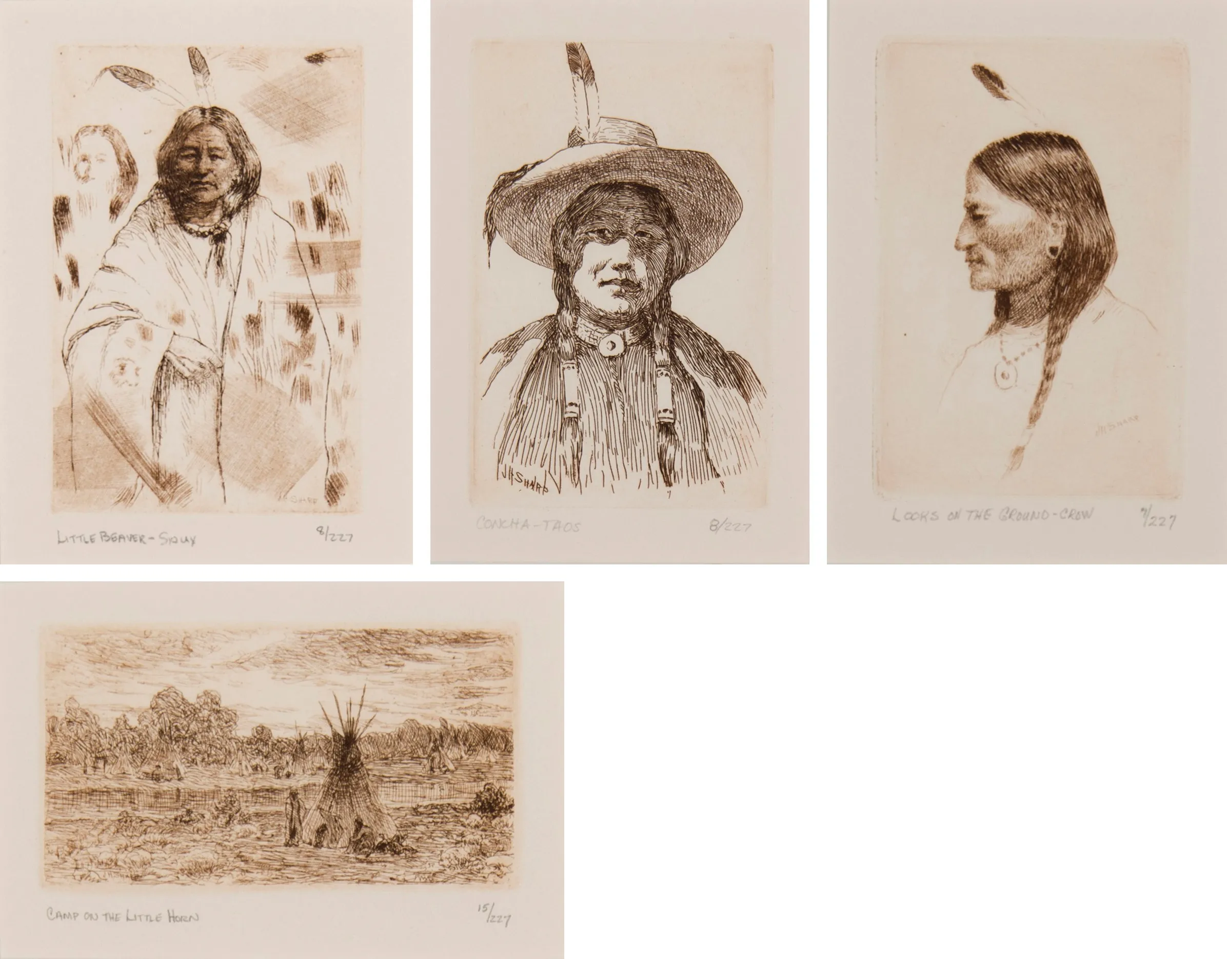 Set of Four: Camp on the Little Horn; Concha – Taos; Little Beaver – Sioux; Looks on the Ground – Crow