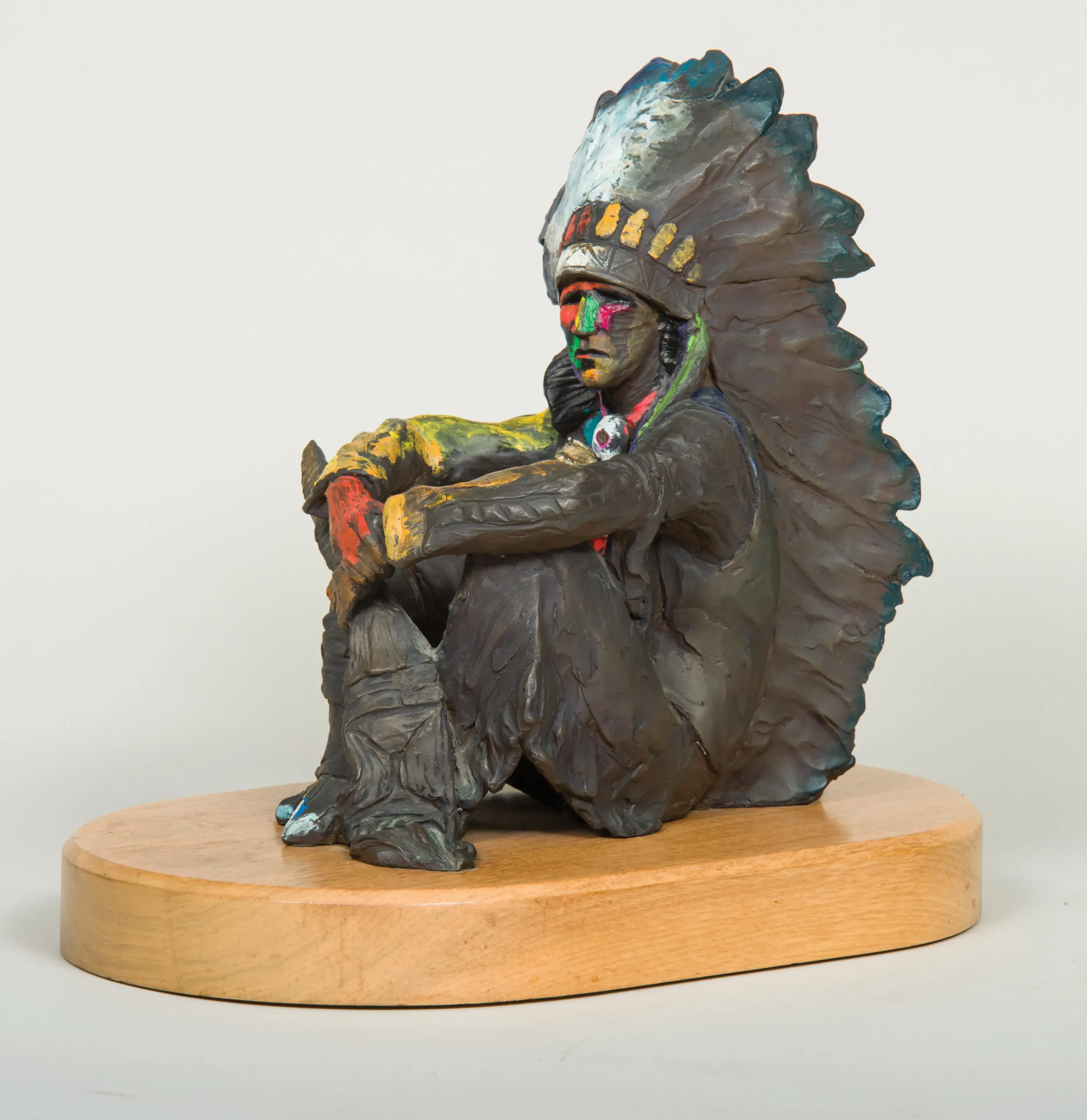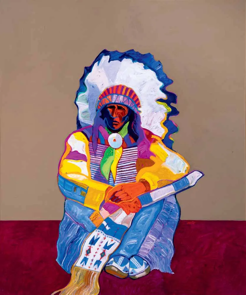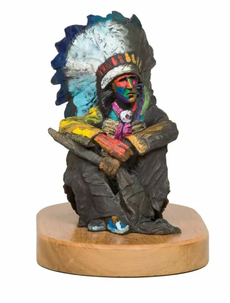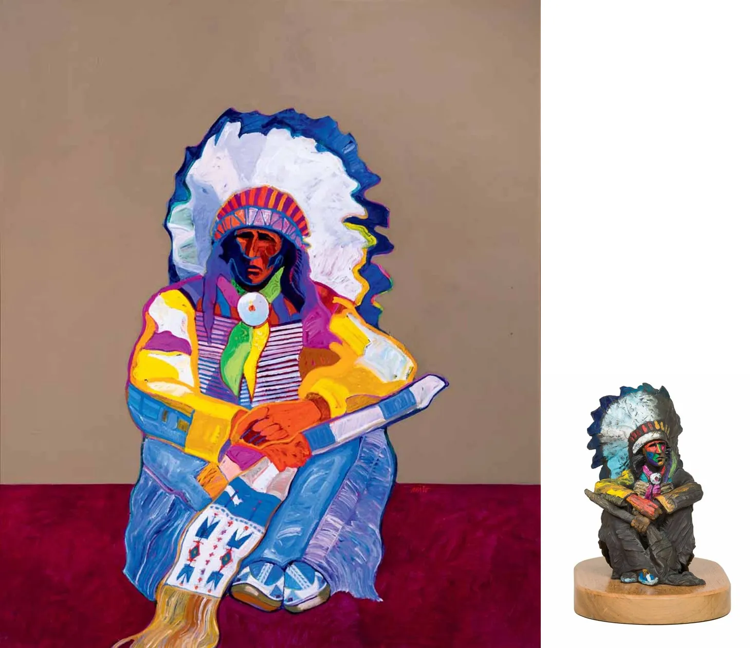 Created in 1995, this unique pairing of oil and bronze is extraordinarily rare for New Mexico artist John Nieto. The bronze is the only sculpture the artist ever completed, and only two casts were made—one that was kept by the artist and this one. Both painting and bronze depict the same subject: a seated Native American chief with elaborate regalia that includes a hairpipe-bead chestpiece, beaded sash and moccasins, feathered headdress and fringed pants. The painting, set against a tan and burgundy backdrop, is done in Nieto’s style with pure-paint application and a modern design of the figure. The artist’s style was revolutionary when it debuted in the 1970s, and it quickly garnered him accolades from all around the world, including at exhibitions at the Salon d’Automne at the Grand Palais in Paris, as well as in Tokyo, Los Angeles and New York City. Nieto was inspired by the four elements: earth, water, fire and wind, and lived his life according to these elements and their meanings.