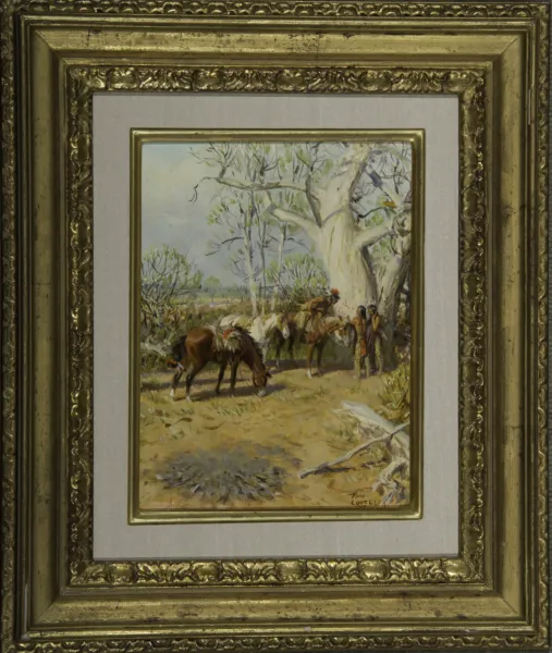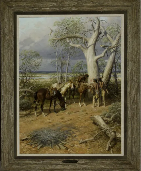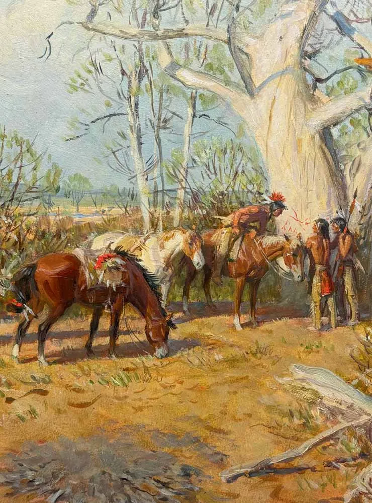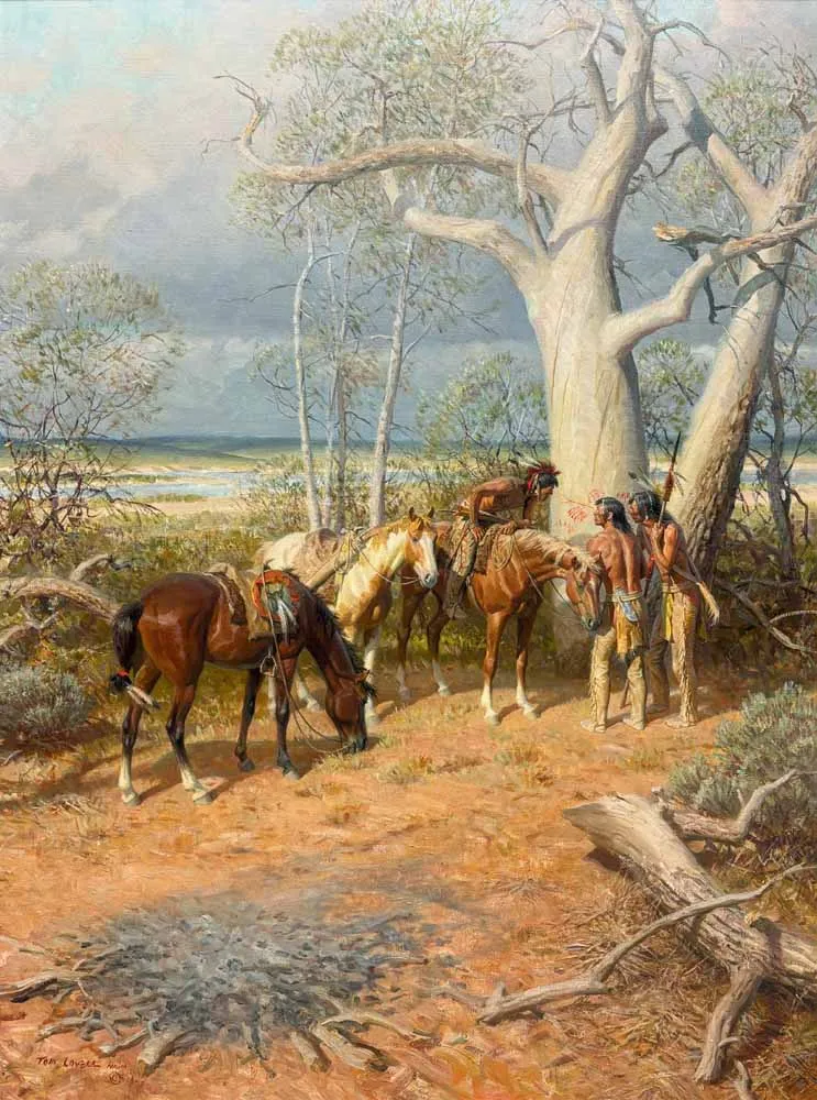 Cottonwood Gazette fits squarely into this theme with three Native American riders analyzing carvings in the light bark of a cottonwood tree. “Stolen horses and enemy scalps were measures of greatness among the warriors of the Great Plains. They were the trophies of battle, evidence of individual acts of bravery to be celebrated,” Lovell writes in his book The Art of Tome Lovell: An Invitation to History. “In 1840, a party of Cheyennes on a horse-stealing raid were attacked by Pawnees on the south fork of the Republican River. There were no survivors of the Cheyenne raiding party. The victorious Pawnees held a scalp dance near the battle site and recorded the event in pictographs on the trunk of a dead cottonwood tree. In this scene, a party of Sioux scouts reads about the fight. They will carry the tragic news to their Cheyenne allies. In the foreground are the ashes of the Pawnees’ scalp dance fire.”