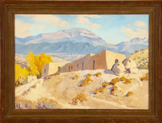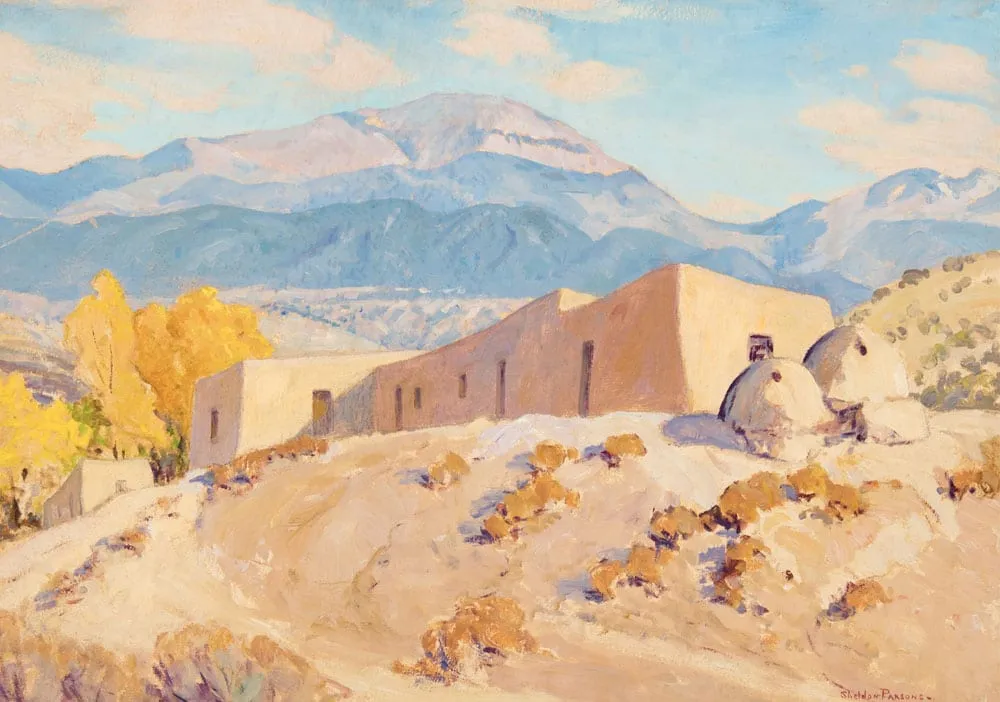 One of the earliest artists to reside in Santa Fe, Sheldon Parsons left a successful career painting portraits in New York in 1913 to make a new start after the death of his wife and to find a climate conducive to his tuberculosis. Parsons studied with William Merritt Chase, and something of this influence lingers in impressionistic New Mexico landscapes such as Santa Fe Baldy, Nambe, which depicts the 12,000 foot Santa Fe Baldy summit from the Nambe Pueblo north of the artist’s home base.