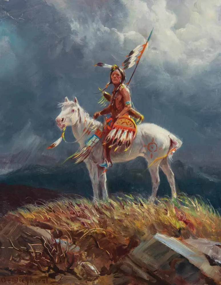 With a history that reads like the most improbable epic ever assembled—child acrobat, sailor, New York City mounted police officer, cavalry rider, cowboy artist—Olaf Wieghorst had one thread that ran through his whole life: horses. He famously told friends he could draw equine subjects without photos or life models. He was also quite critical of other artists who would paint the wrong cowboy gear in their paintings. This dedication to authenticity translated into his Native American work as well. “I don’t like to paint by guess and approximation,” he said in the book Olaf Wieghorst. “That just isn’t fair to the serious student of history. All the information the future generations will get of the passing of the West must surely come from the pen of the author and the brush of the artist. I will often spend more time researching a painting than I do in painting it.”