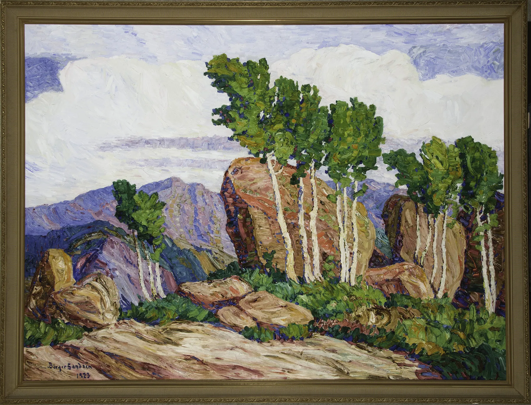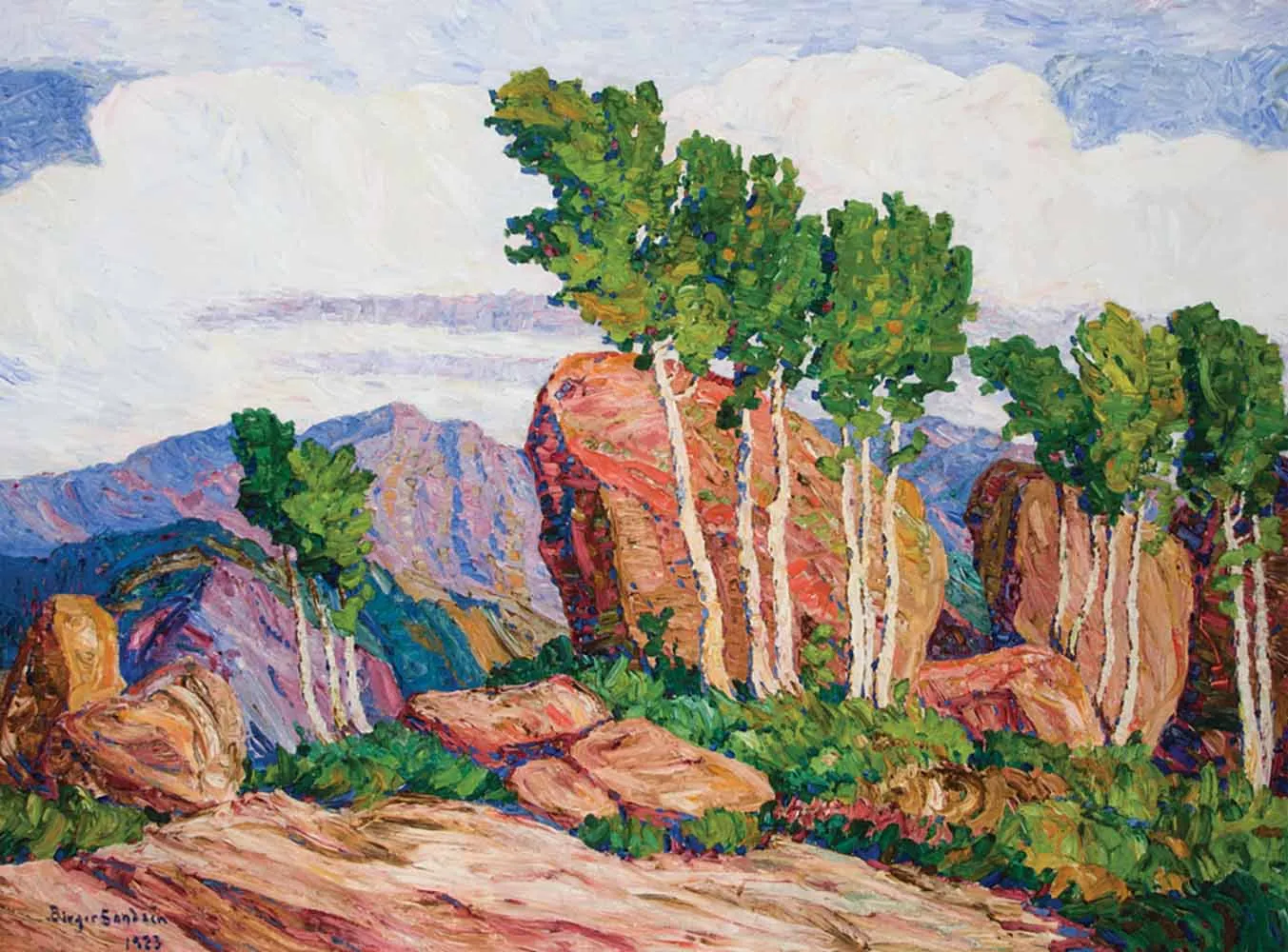 Born in Sweden in 1871, Birger Sandzén never strayed far from his interest in painting. As soon as he was able, he began studying art in Sweden and later in France, as well as getting instruction and motivation from Anders Zorn, Richard Bergh and Per Hasselberg, one of Sweden’s top sculptors. After returning to Sweden from France in 1894, a friend sent Sandzén a booklet on Bethany College in Lindsborg, Kansas. He was immediately intrigued by a line in the booklet referring to Lindsborg as “Little Sweden.” By the end of that year, the artist was in Kansas teaching French, art history, drawing and painting at Bethany College. Later travel to New Mexico and Colorado helped refine his artwork, which would soon include bright patches of thickly applied paint. The combination of impressionism and heavy impasto within Western subjects was quite unique at the time, and it elevated Sandzén’s presence in the United States. Although he would continue to travel around the country, Sandzén always returned to Lindsborg, which is where he died in 1954, 50 years after he arrived.