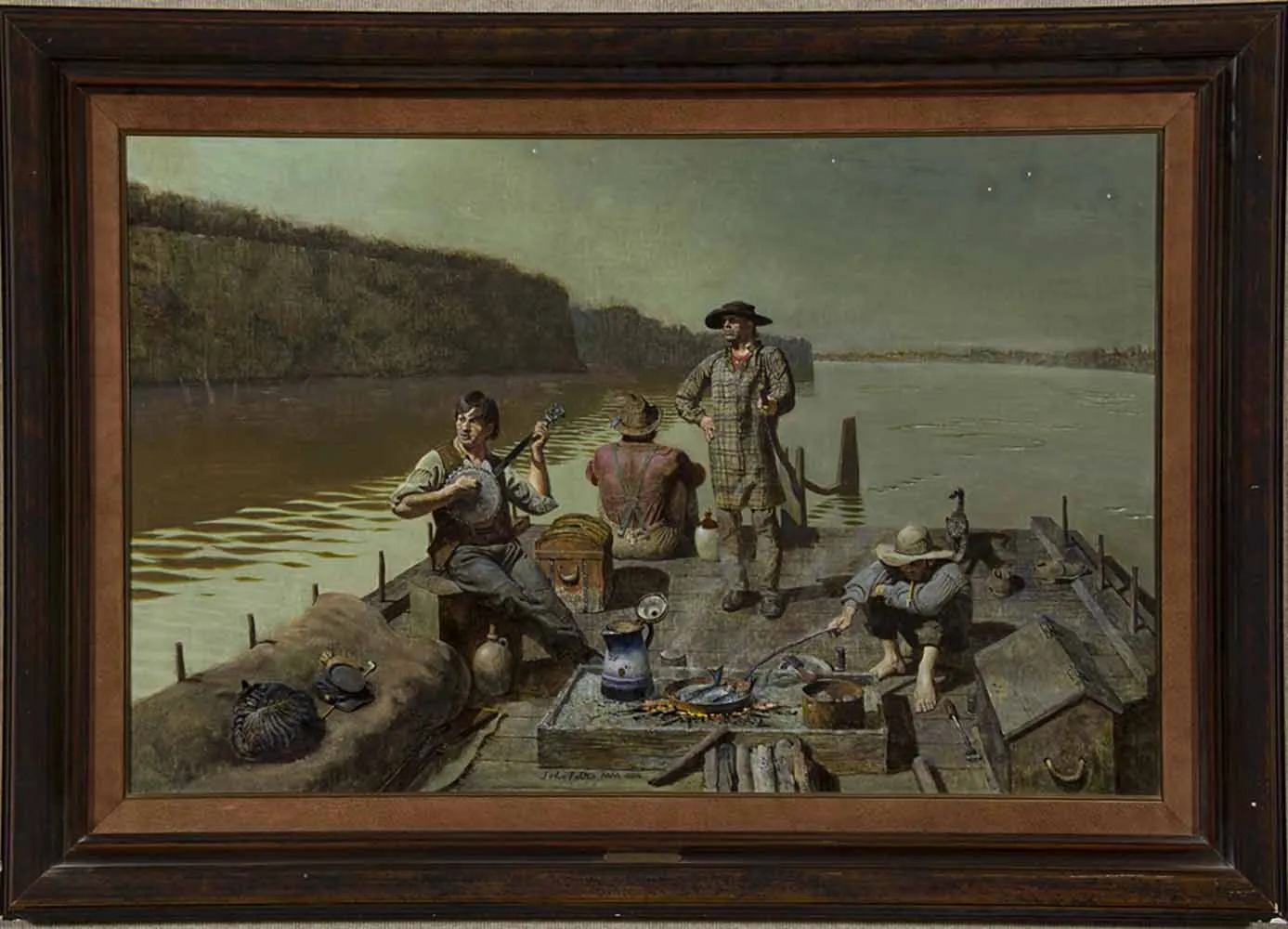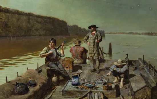 Certainly inspired by the flatboat paintings of George Caleb Bingham, John Falter’s The Bluffs Have Eyes offers an alternative, slightly more realistic posing of river life. Where Bingham offered grand, almost musical depictions of his “jolly flatboatmen,” Falter’s rendition is less romantic, but grittier and more lived-in—perhaps a more authentic representation of a difficult and dangerous profession. Of particular note in the work is the level of detail: two cats, the raised platform that contains the cooking fire, the uniquely dressed figures, a constellation in the night sky and the ripples of jumping fish in the river twilight. A viewer would not require much imagination to hear the soft strums of the banjo music or the gentle lapping of the water against the flat hull of the boat.