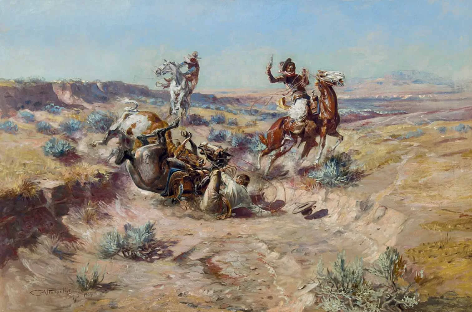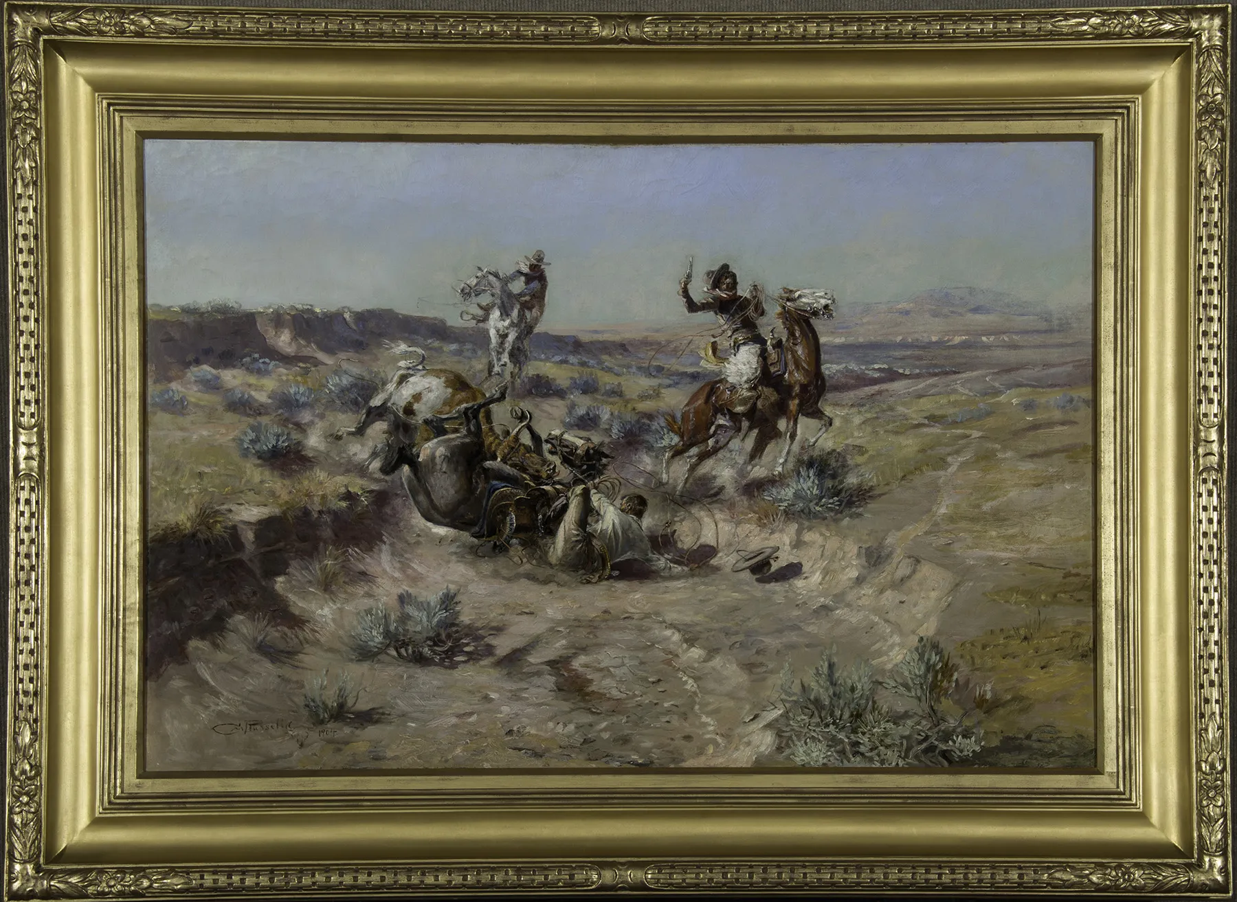 The painting is likely a loose continuation of events that appear in earlier paintings Mad Cow and When Cowboys Get in Trouble (The Mad Cow), both of which show a charging cow but with all riders still in their saddles. The “mad cow” part of Broken Rope is likely a reference to something Russell saw during his cowboy days: when a mother cow would lose its calf, either to wolves or natural causes, it would go “mad” without a calf to relieve the pressure of milk in its udders. These animals would often charge and create problems for the cattle wranglers. Broken Rope tells a similar story, but the composition is unique to the other “mad cow” paintings, which might be the result of his visit to New York City earlier in 1904. During that fateful trip, Russell would inquire with John Marchand and other accomplished artists about creating more dynamic compositions. It’s possible they gave him some tips that manifested in this painting, including the arroyo that funnels the eyes of the viewer into the action and the still-falling hat that shows the action in the scene is still unresolved. Another little detail in the work is the rider’s worn-out and patched pants, which hint at Russell’s Blackfeet nickname, Ah-Wa-Cous. The artist was prone to wearing patched pants, which was noticed by his Indian friends, who began to call him the Blackfeet word for antelope, due to the light patch of cloth on his hindquarters.
