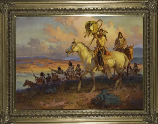 Although he painted similar subjects to several of his esteemed contemporaries—artists such as Howard Terpning and Ken Riley—Roy Andersen often pushed his work into new territory with his use of color, which he painted with an intensity that would vibrate on the canvas. He was especially adept at warm tones—red, orange, yellow and gold—which he would use to draw attention to the brilliant light and atmosphere of the Great Plains and its original inhabitants. In Dream Spinner: The Art of Roy Andersen, the artist provides a picture of his paint palette, which is covered in colors with fascinating names: cadmium yellow orange, rose crimson, thalo rose, cadmium red deep, terra rosa and others. These are the colors that bring his images of Plains Indians to life. They are also the colors that are seen in The Challenge, a large and magnificent piece that exemplifies Andersen’s skills as a painter and colorist.