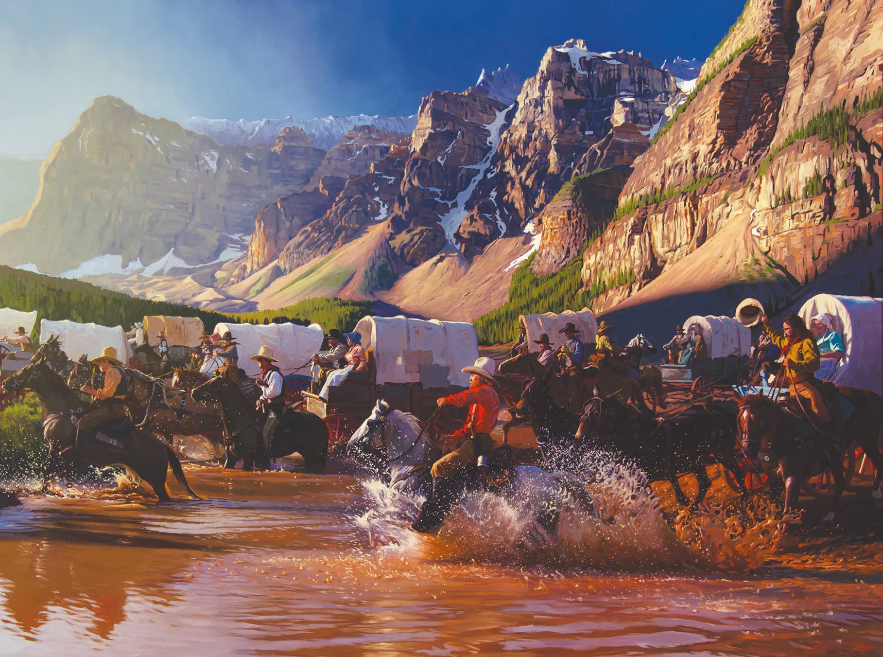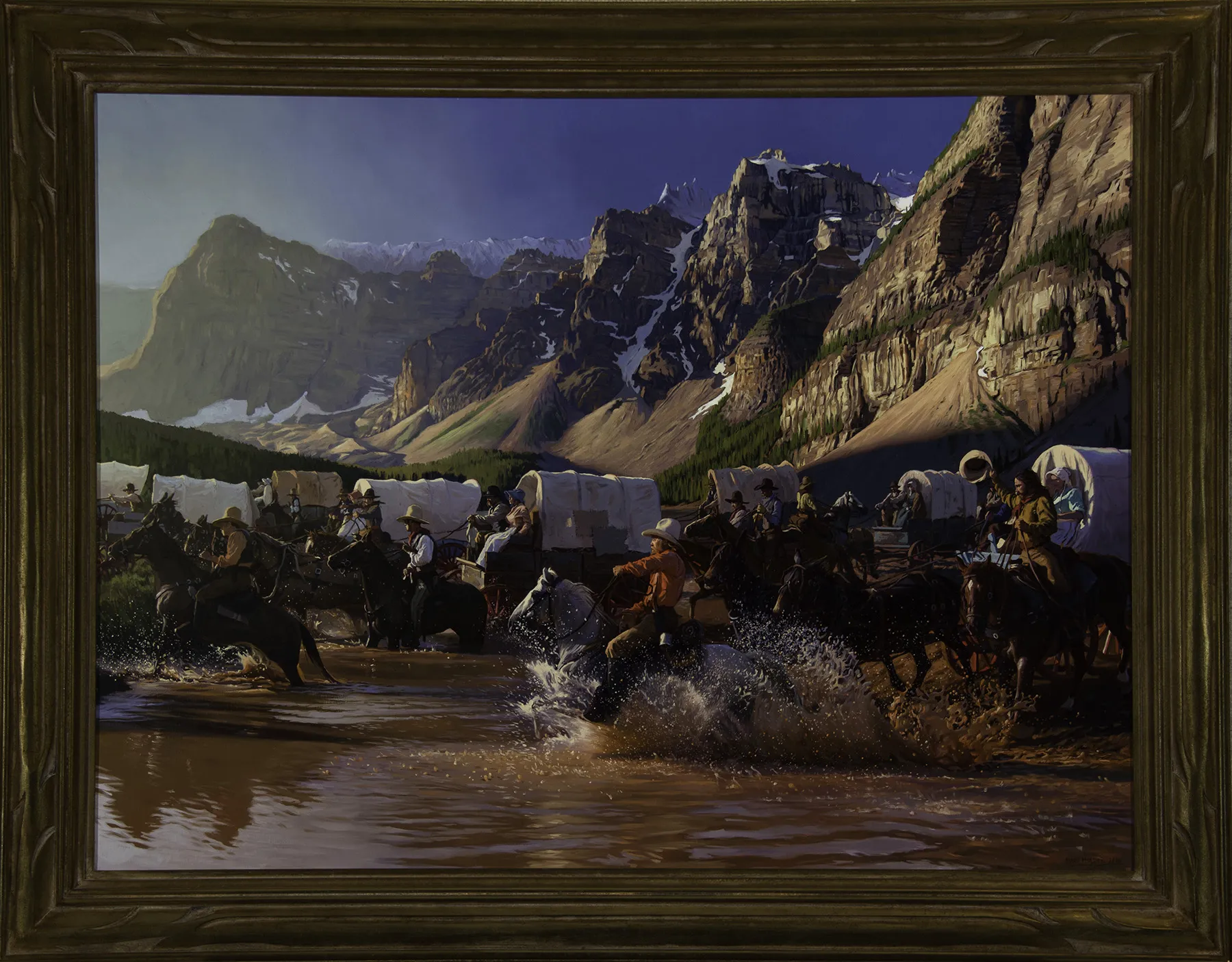 In his first year at the Masters of the American West at the Autry Museum in Los Angeles, Mark Maggiori brought several key paintings that would help establish his work within the world of Western art. One of them was The Crossing, showing a chaotic river crossing with dozens of figures on horses and nearly as many covered wagons. It was an ambitious work, particularly with splashing water in the foreground and detailed mountain peaks in the top half of the image. “After I finished the mountains, I had to put the whole bottom part aside for maybe two months,” Maggiori told Southwest Art. “Then, one morning, I told myself to just do it, step by step, like climbing a gigantic staircase. It took me maybe three weeks of long, hard, sweaty days and lots of coffee. But it was one of those epic paintings I want to do once in a while.”