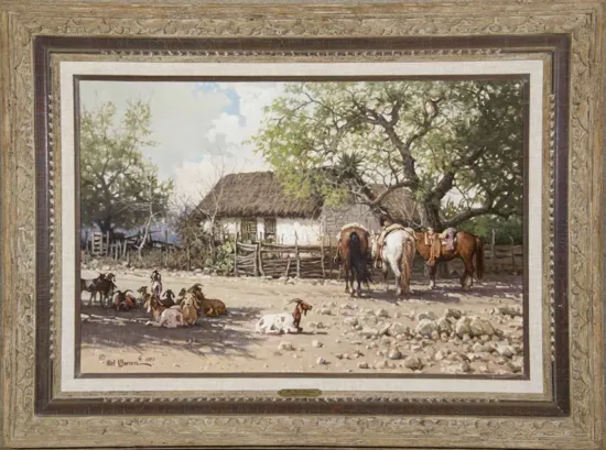 Born in Los Angeles in 1920 as the last breaths of the Old West still lingered in the Pacific air, Melvin Warren didn’t wait long to head deeper in the Southwest to seek out adventure. After brief stints in Arizona and New Mexico, Warren landed in Texas at just 14 years old. Life on the ranch was interrupted by World War II, during which he served in the Air Force. At the conclusion of the war, the young artist attended Texas Christian University, where he received a degree in fine arts. He worked in commercial art during the day, but after clocking out of his job he pulled his focus to paintings with Western themes and subjects, including images of cowboys and cattle, horses, Mexican vaqueros and bandits, desert nocturnes and much more. In addition to being voted into the Cowboy Artists of America, Warren was also collected by President Lyndon Johnson, a fellow Texan.