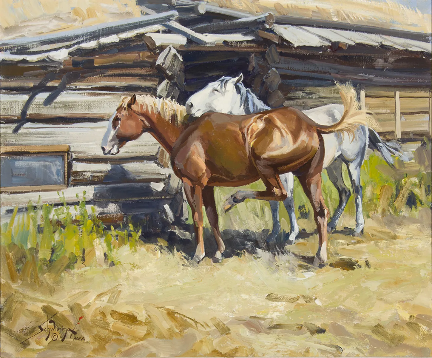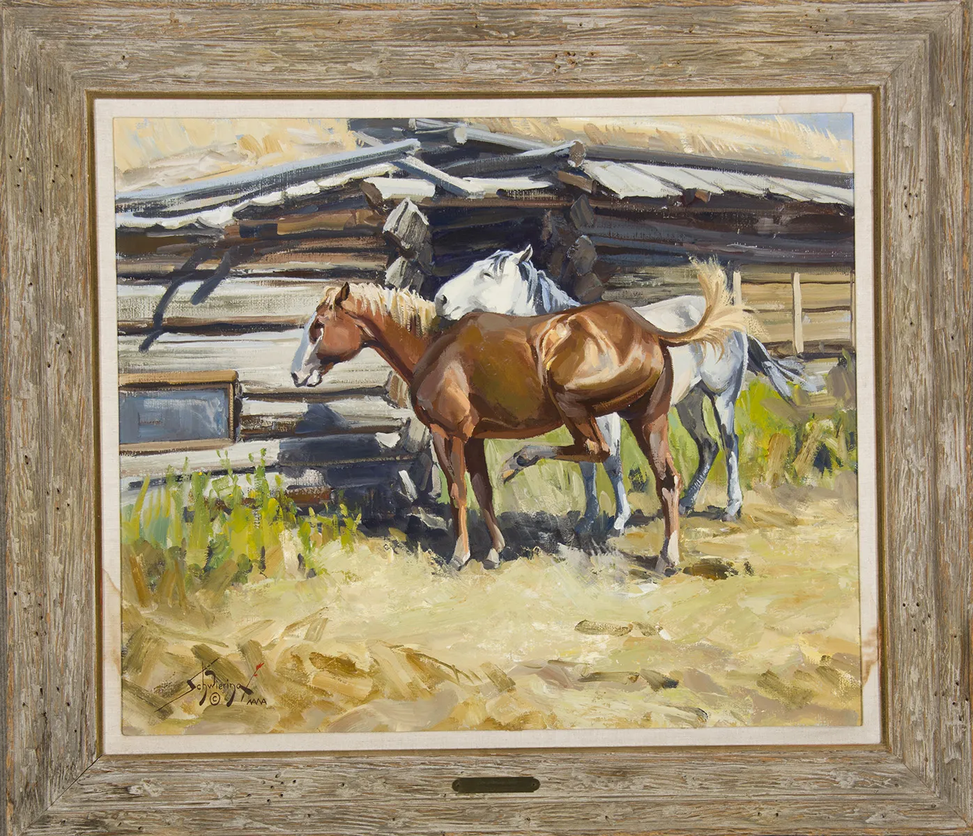 Conrad Schwiering moved to Jackson Hole, Wyoming in 1947 and maintained a permanent home and studio at Antelope Flats north of Jackson. He was born in Boulder, Colorado, and graduated from the University of Wyoming. Schwiering was a charter member of the National Academy of Western Art (NAWA). He exhibited paintings in China in 1981 and in the Cowboy Hall of Fame at Oklahoma City in 1985.”