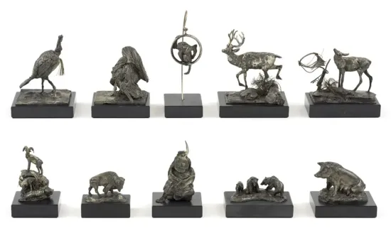 Originally offered in the 1970s at the C.M. Russell Museum, and only to museum members, the Trigg Silver Series consists of 10 finely made and highly detailed sculptures in sterling silver created from the original collection that is now held in the museum’s permanent collection. Limited to just 100 editions (this set is No. 16), the set features a nice grouping of Russell subjects, including buffalo, grizzly bears, bighorn sheep, a pair of mule deer, a seated Native American figure and a turkey, among others.