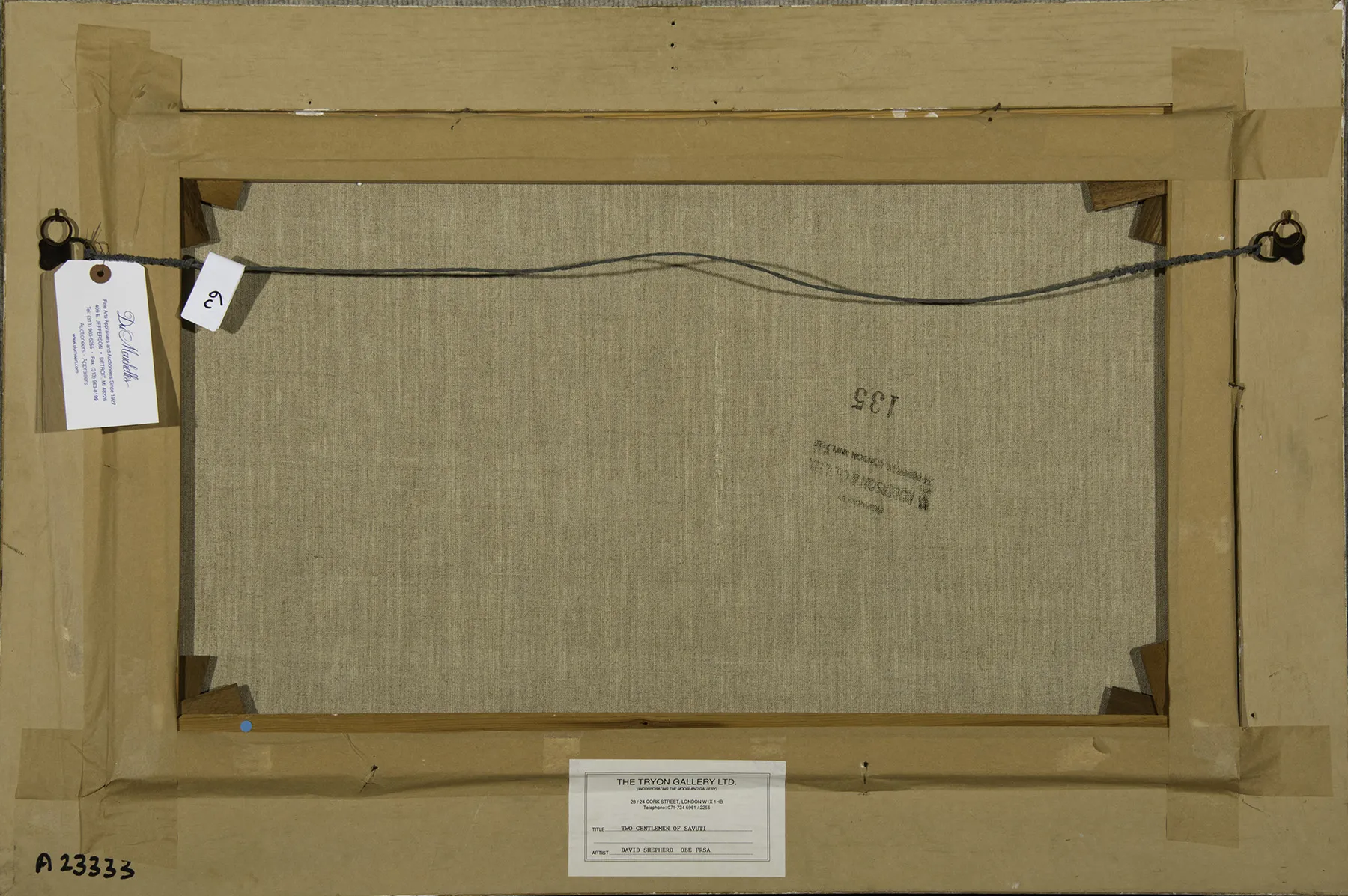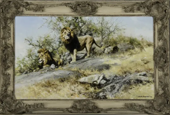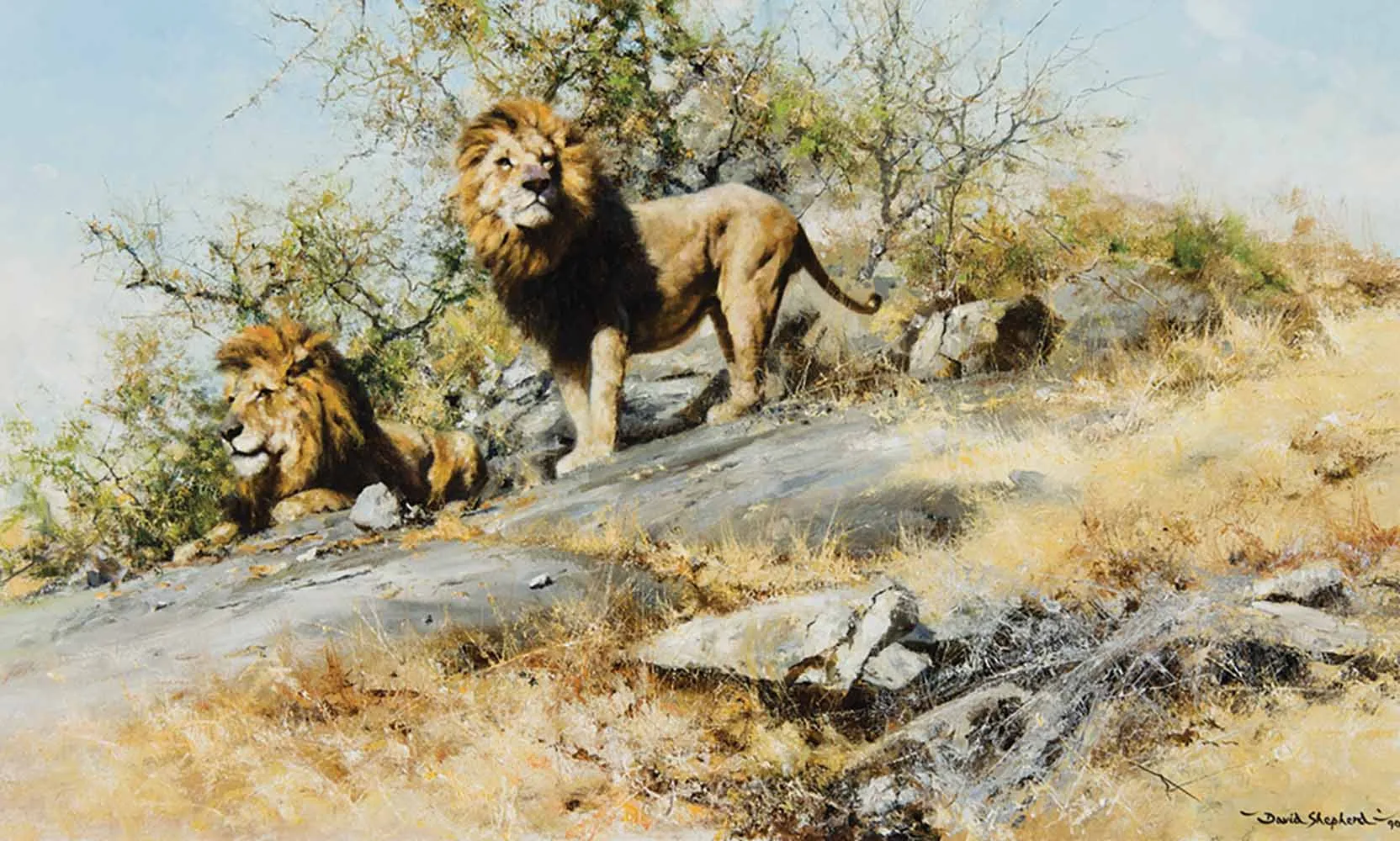 As London-based painter David Shepherd was coming up in the world as an artist, his first assignment was airplanes that sat on an airport runway. Shepherd happened to really like airplanes, so the gig was a good fit, but he longed for something different. He discovered what different was when the British Royal Air Force sent him to Africa to paint even more airplanes. It was there he started painting elephant portraits for the first time—it would change his career. After that fateful 1960 trip, Shepherd became one of the leading artists for African and Asian wildlife, with elephants, tigers and lions as his favorite subjects. In addition to his paintings, which were a hit around the globe, Shepherd also became an outspoken advocate for animal conservation, some of which was funded through his fine art prints and reproductions. One of those hit prints was Two Gentlemen of Savuti, showing two lions scanning the horizon on a hill looking out over northern Botswana. The original painting of Two Gentlemen of Savuti, is being offered here.