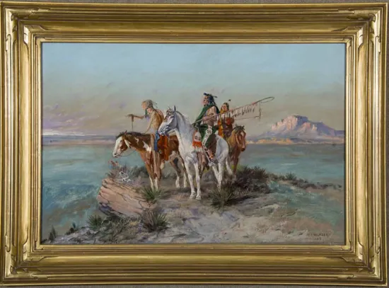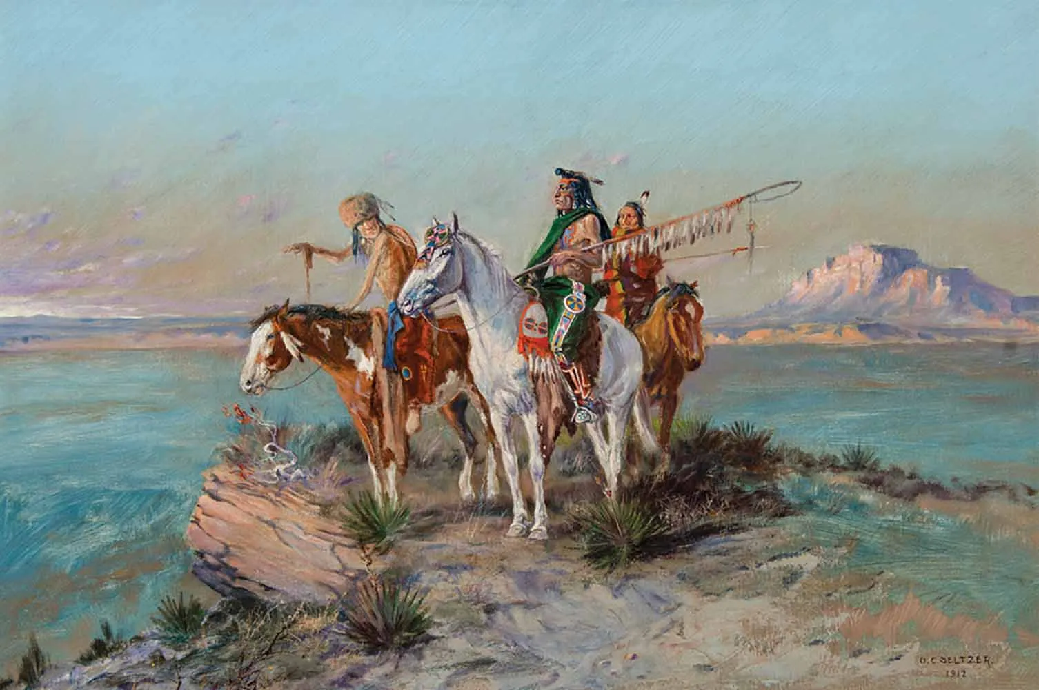 Much discussion has taken place over the course of the last century about the similarity of Seltzer’s work to that of Russell’s, but the two artists were friendly with each other and Russell’s reaction to Seltzer’s painting style was one of encouragement for the younger artist and flattery that another painter would admire his work so dearly. Today, collectors of their works marvel not at their similarities, but their differences. Each had his own painting style, subjects and ways of composing a scene. Although their works are linked by their friendship, both are collected on their own merit. “He once said, ‘If there is anything of lasting value in my art, it will survive. If not, it will perish,’” writes Larry Len Peterson in his book The American West Reimagined. “He would be happy to know that him and his art—2,500 oil and watercolor paintings—were not forgotten.”