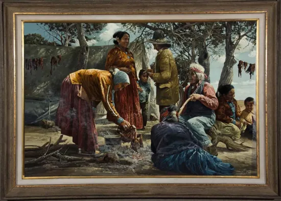 While many of his contemporaries were examining Native Americans from the 19th century, painter Ray Swanson was more interested in present-day cultures, particularly the Navajo people of Northern Arizona. A stunning example of this contemporary vision of Southwest life can be seen in Waiting for Mutton Stew. “This cooking scene is a common sight at campsites or anytime during the summer months when it is too hot to cook in the hogan,” Swansons writes in The Art of Ray Swanson: Celebrating People and Lifestyles. “The men and women complete the various preparations for the day’s meal. Strips of mutton, meat from an adult sheep, hang to dry like clothes on a line. Mutton is tougher than lamb, but it can be very tasty when cooked with vegetables in a stew pot. Some sheep ribs are also cooked over a wood fire, while dough is prepared for fry bread. Whenever I smell burning juniper wood, it reminds me of a Navajo campsite.”