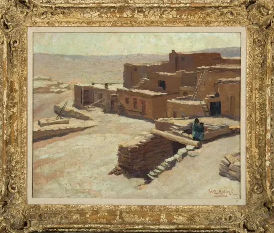 Born in Nevada and raised in California, Warren Rollins studied at the San Francisco School of Design then moved to San Diego where he began to paint Native American scenes. Rollins traveled the West with his wife and family, and his work attracted attention. In 1917, the Santa Fe Railroad set him up in a studio overlooking the Grand Canyon. Rollins painted in Taos with his good friend, E.I. Couse, but he will forever be known as the “Dean of the Santa Fe Art Colony.” Blue Canyon, Arizona has the easy pastel feel you find in Rollins, of an enduring world glimpsed through gauze.