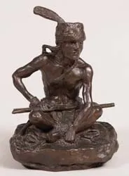 Watcher of the Plains depicts a Piegan scout, sitting on an overlook, quietly surveying the territory below and around him. He might be the leader of the party or simply part of the vanguard of a raiding party. His hand is on his flintlock, ready to fire a warning shot or to defend himself. The stillness in his body is intense. The model for Watcher of the Plains, as Stewart suggests, may have been “White Quiver, a Piegan warrior of rare sagacity and daring,” (p. 337) Prominent New Mexico rancher Albert K. Mitchell, who once owned this work, donated the bulk of his splendid collection to the Cowboy Hall of Fame in Oklahoma City.