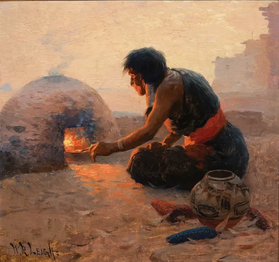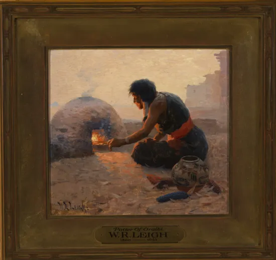 Oraibi, a Hopi village in Arizona, was one of those ancient unspoiled places William R. Leigh marveled at. In Potter of Oraibi, Leigh shows us a young woman–pottery in the pueblos was traditionally the province of women–tending to a pot as it fires in the conical oven. The smoke from the fire and the glow from the oven as it is reflected in the woman’s face suggest the spirit that each piece of pottery possesses. A beautifully rendered and painted jar sits beside the potter, and, at left, the crags of the adobe wall glow in the low light.
