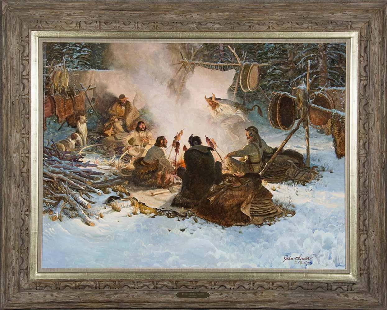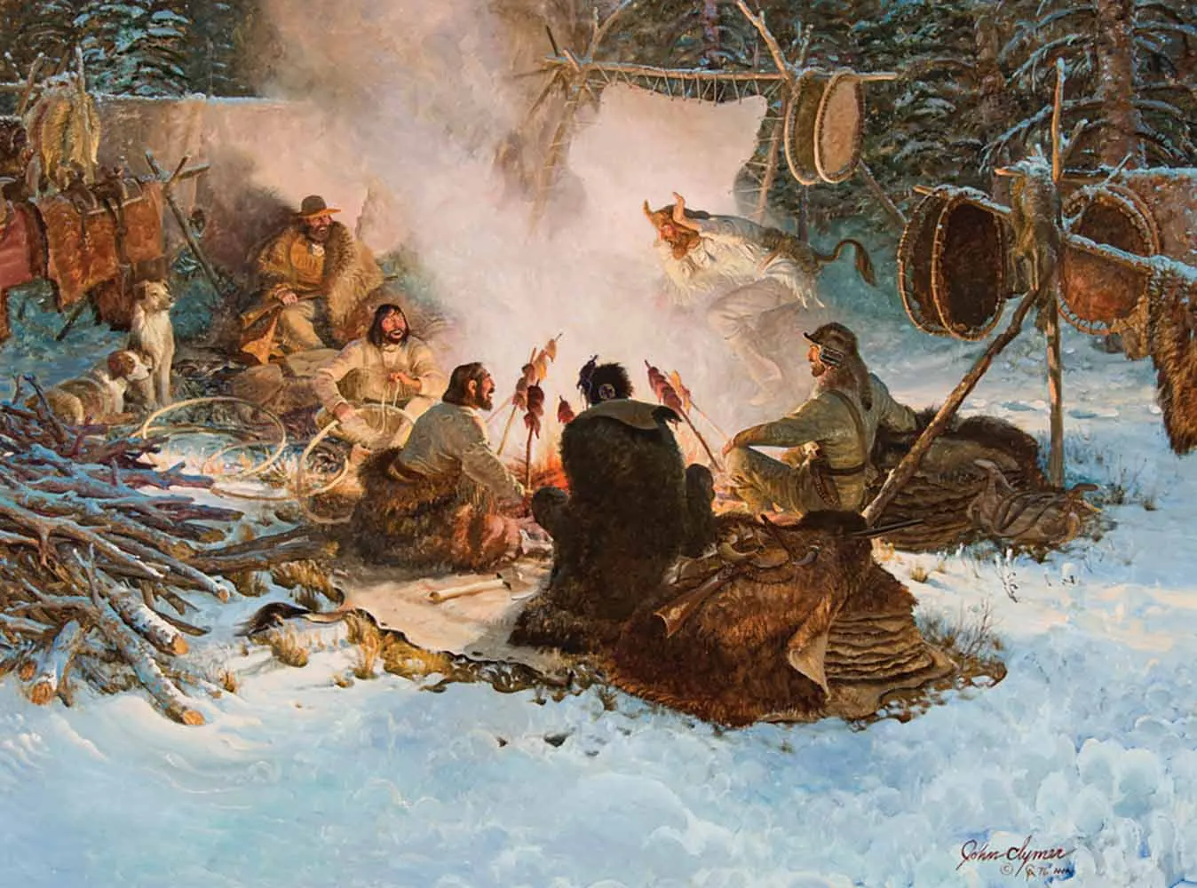 With a John Clymer painting, it’s all in the details. His works are meant to be explored with the eye. A piece like Wood Smoke Tales is a perfect example of this phenomenon. It rewards those who poke around the composition, admiring the tiny pieces of history that the artist hides within the fully realized story. And there are many details in Wood Smoke Tales: the smiling figure making willow hoops for beaver pelts, the skewers with chunks of meat smoking over a roaring fire, the serious expression on two dogs huddled at the edge of the painting, a light dusting of snow on a pile of firewood, and the way the figure furthest from the fire is bundled against the cold while those closest to the flames have shed their blankets.