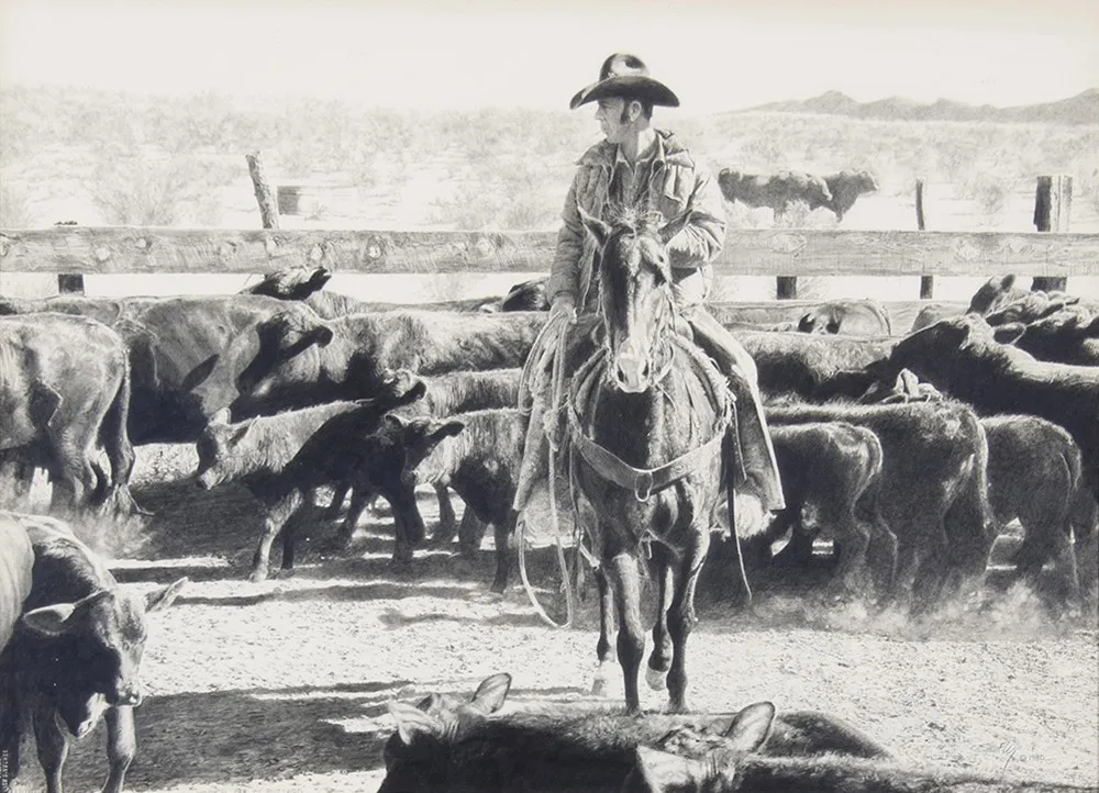 Robert (Shoofly) Shufelt is an American cowboy artist known for his realistic pencil drawings of contemporary Western culture. Born on February 16, 1935, in Champaign, IL, Shufelt studied at the Art Institute of Chicago and the University of Illinois and spent the early part of his career as an illustrator. Shufelt moved to Arizona with his wife and was impacted by the life of the working cowboy and decided to use his drawings to tell their stories. “My goal has always been that my drawings will continue to grow in stature,” he has said, “illustrating a cowboy legacy long after I am gone.” He is the recipient of numerous awards, including the 2010 Artist of the Year from the Tucson’s Friends of Western Art organization, and has been exhibited at the National Cowboy and Western Heritage Museum, the Phoenix Art Museum, and the Albuquerque Museum, among others. Shufelt lives and works in Wickenburg, AZ.