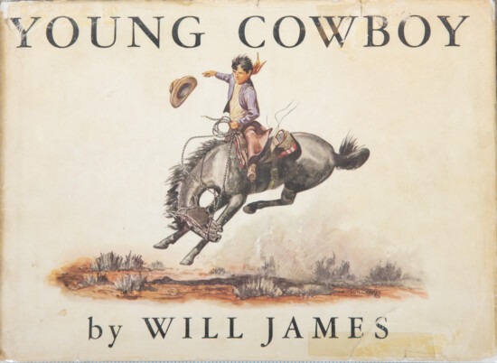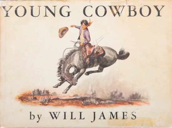 Originally published in 1935, Will James’ Young Cowboy was a children’s story told from a child’s perspective. In the story, young Billy Roper dreams of becoming a cowboy like his father. On his fourth birthday, Billy is given his first horse, a black horse named Big-Enough. The 72-page book chronicles the next several years as Billy and Big-Enough grow to trust each other so Billy can become a “good, all-around cowboy on his father’s ranch.” The book contains 15 illustrations, in addition to four color plates, a title label on the cover and the frontispiece, seen here. All were done by James. Later editions of the book moved this color image to the cover instead of the original black-and-white drawing.